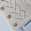 The 16 sts x 12 rows of the center lace panel = 3.625”/9.2 cm wide x 1.875”/4.75 cm long after blocking using US 7/4.5 mm needles, worked flat in the Cables and Lace stitch.