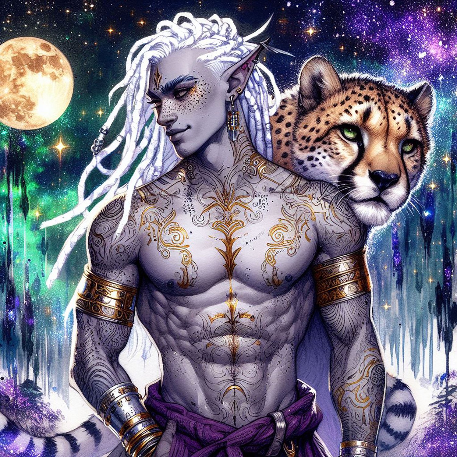 Male Elf with dreadlocks and his Cheetah