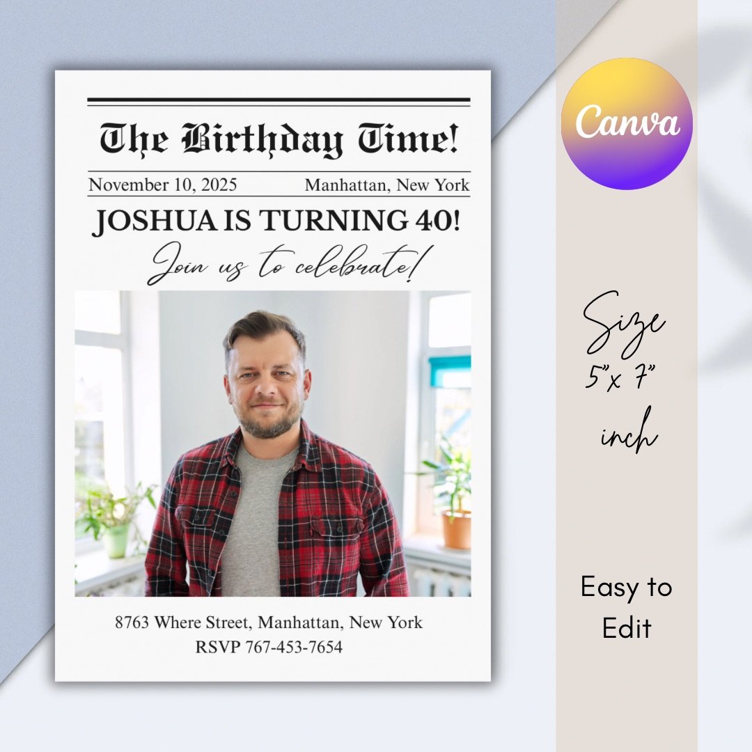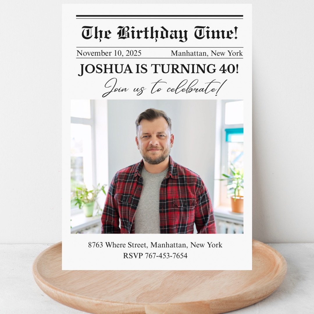 Perfect for 40th birthday parties, milestone celebrations, vintage parties, and fun newspaper-themed events. Make your party unforgettable with this unique newspaper-style birthday invite!