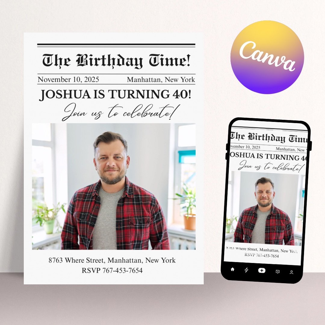 Celebrate a milestone birthday in style with this 40th birthday party invitation designed like a classic newspaper headline! This printable and editable digital invitation is perfect for friends and family. Customize easily in Canva with the birthday person’s name, date, time, and location.