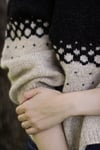 Construction: The Halftone Pullover is worked from the top-down in the round. First, the collar is worked in 1x1 ribbing with the option of working a folded collar. German short rows shape the front of the garment & lift the back neck. Raglan increases grow the yoke, and the garment is divided into body & sleeves. After the division, the colorwork motif is worked on body & sleeves separately. Optional short rows may be worked on the body to further lower the back hem. Body & sleeves are then worked in the round in stockinette and finished with more 1x1 ribbing.