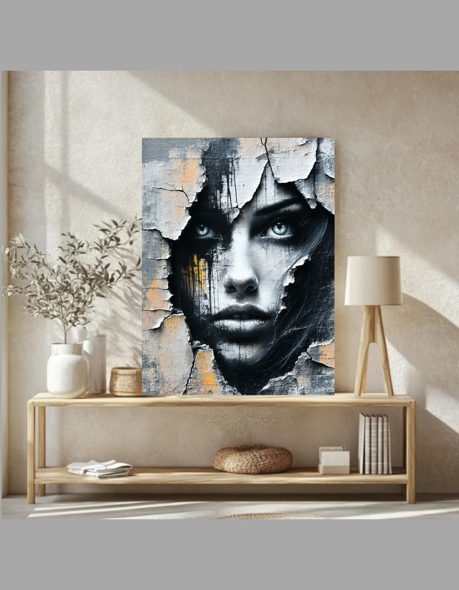 Beautiful Woman Cracked Wall Abstract Portrait PNG Digital Download 300 DPI Printable Art Emotional Female Face Modern Home Wall Decor