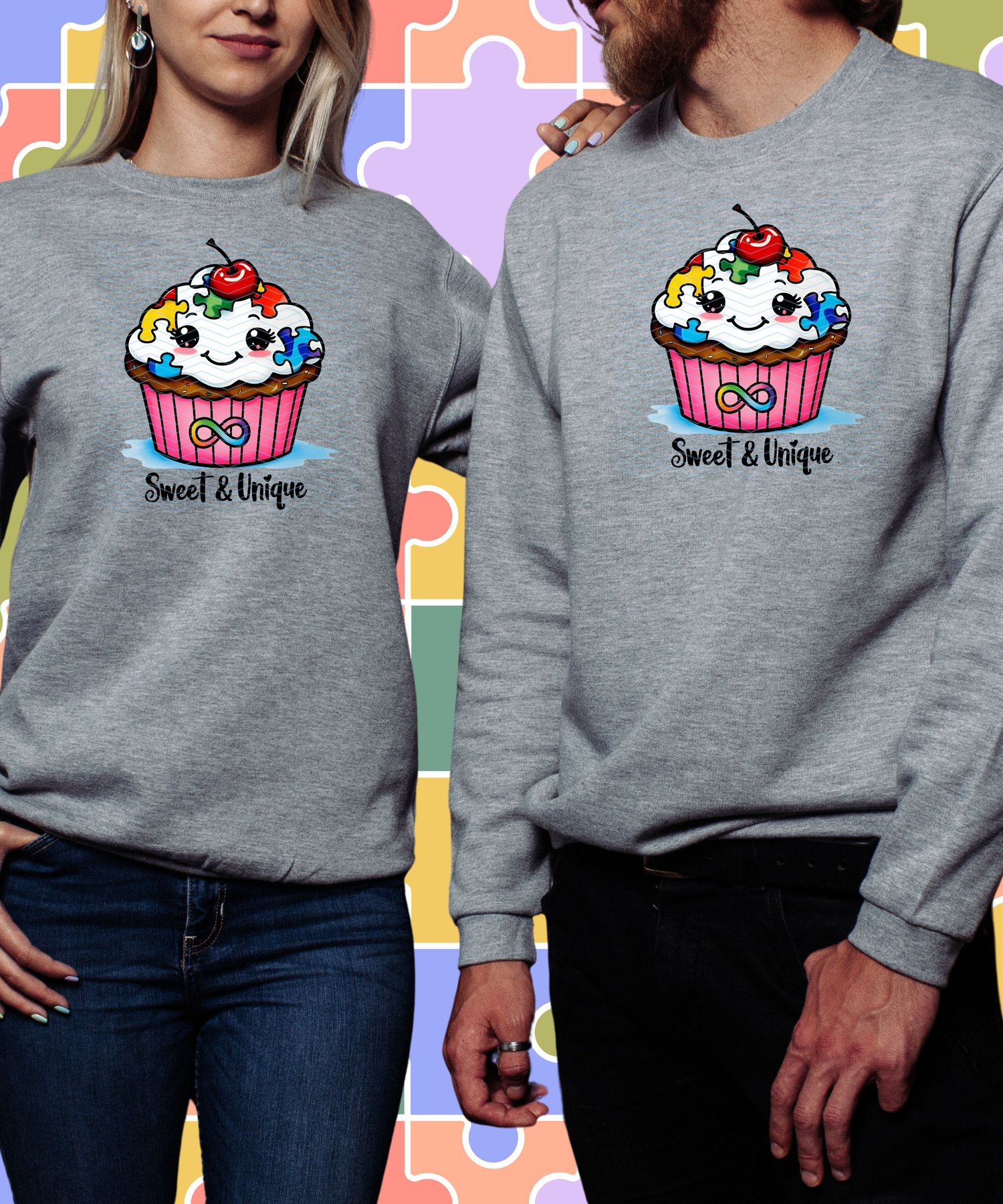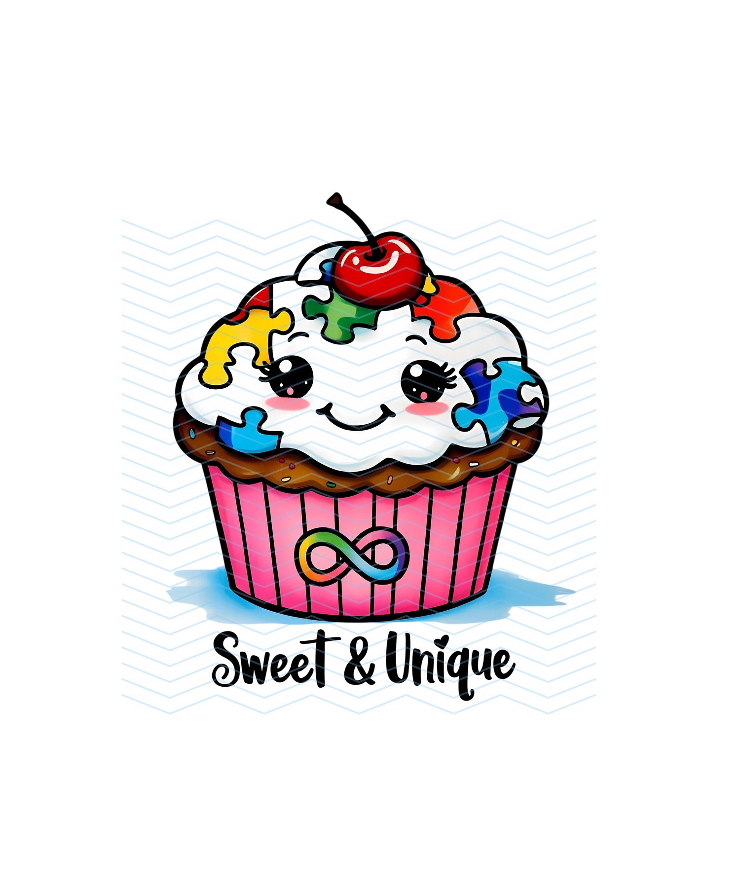 This cute and cheerful puzzle cupcake design is perfect for celebrating neurodiversity in a fun way! With bright puzzle pieces, a happy face, and a cherry on top, it’s a sweet way to promote awareness. Perfect for kids and adults alike on T-shirts, mugs, and stickers.