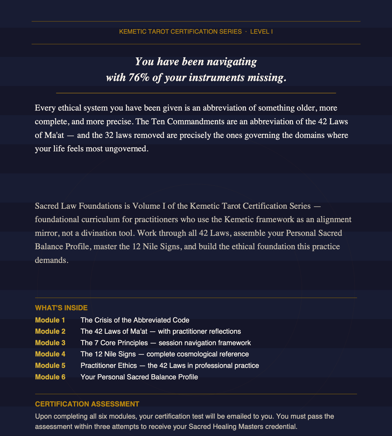 Headline: The Foundation of All Sacred Practice: Reclaiming the 42 Laws. Description: Stop navigating life with a partial map. While the world has been operating on an abbreviated code, the Sacred Law Foundations restores the full 42 Laws of Ma’at to your daily practice. This isn't just a study guide; it is the ethical and cosmological ground you must stand on before you can hold space for others.