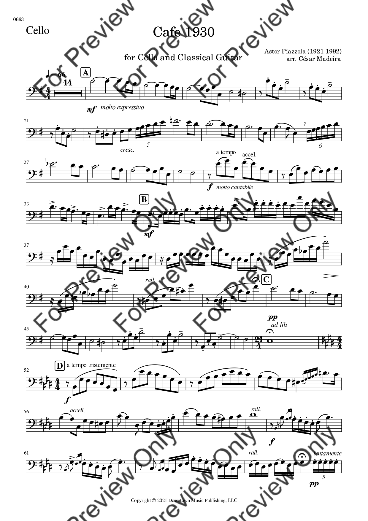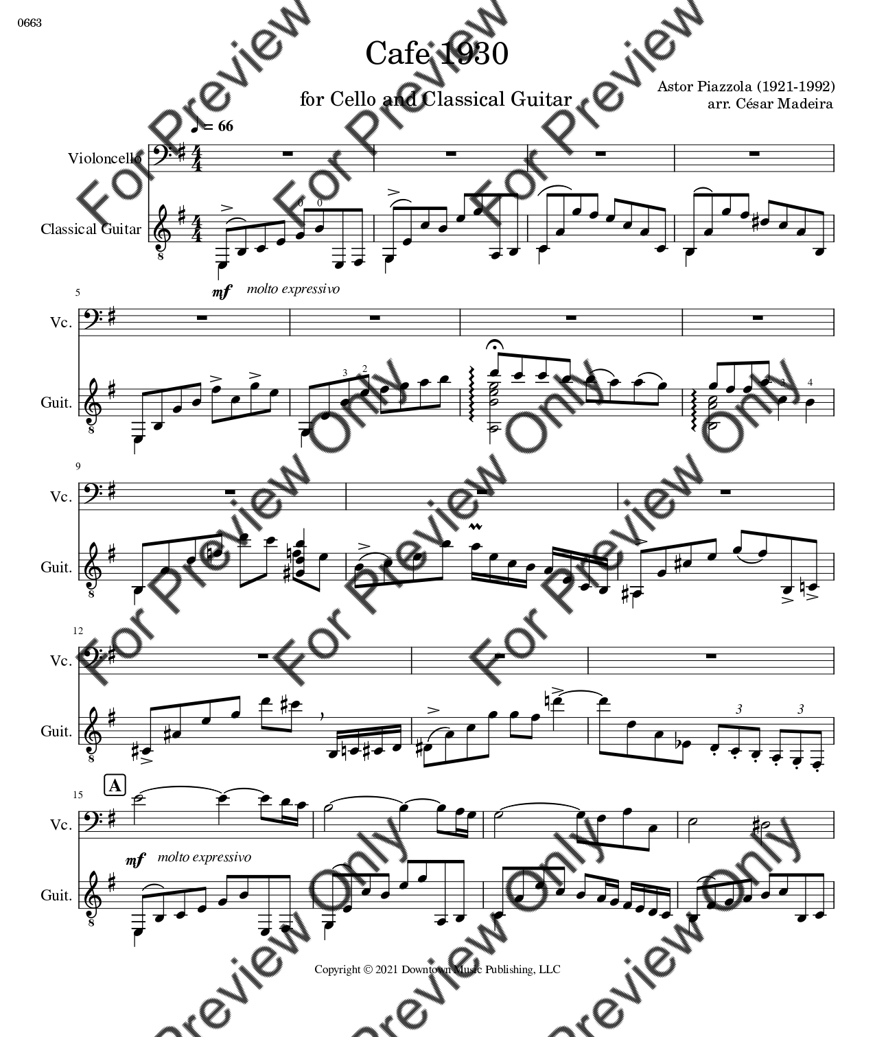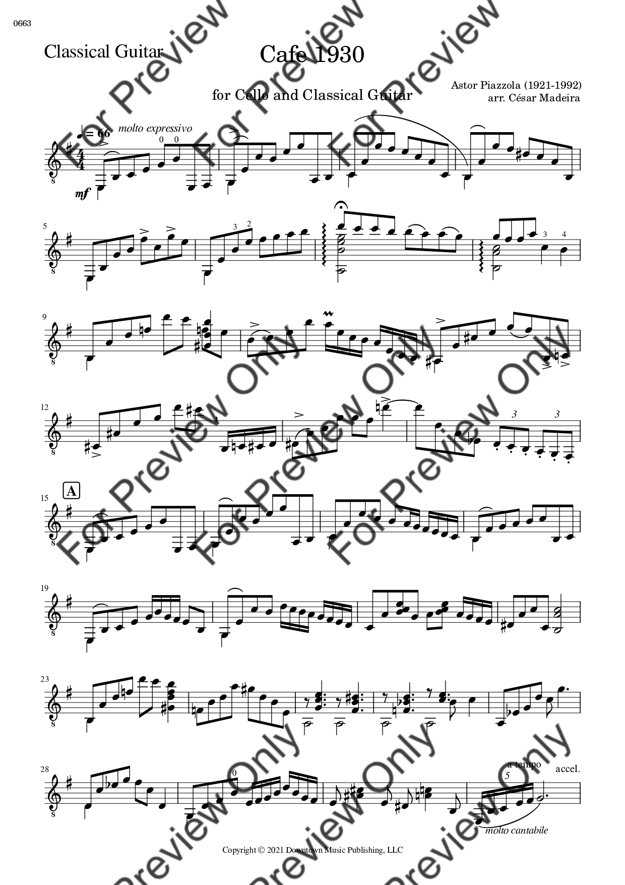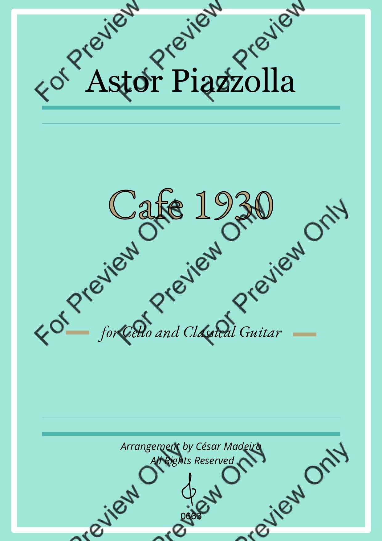 Cafe 1930 by Astor Piazzolla. Arrangement for Violoncello and Guitar. With Full Score and Individual Parts. Have fun!