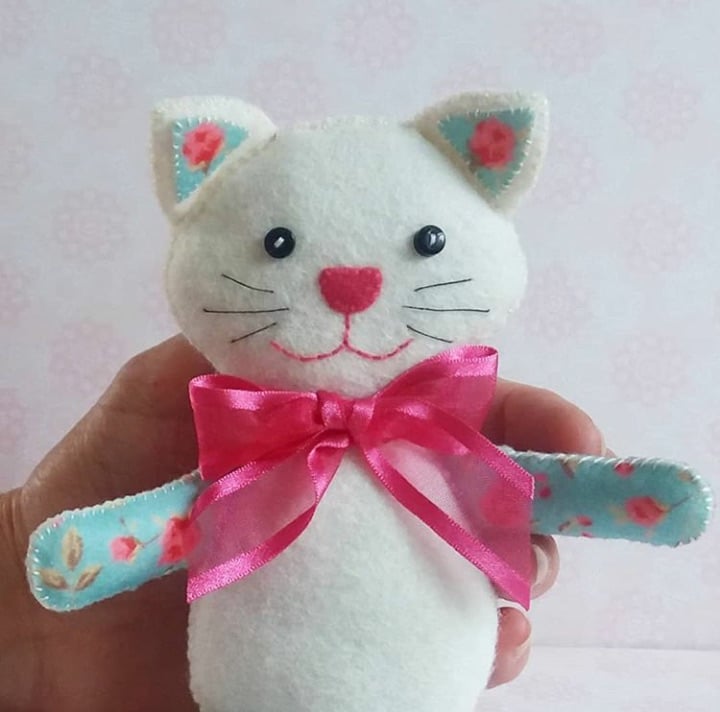 Who can resist Dizzy Izzy Kitty named after my own little cat? This sweet little cat doll is only 8.5 inches tall and is made from plain and patterned felt with cute button eyes, embroidered features and a pretty ribbon bow.