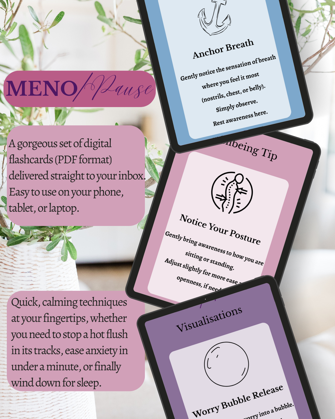 Introducing the Menopause Flashcard Bundle – your portable, powerful toolkit designed to help you calm your body, soothe your mind, and feel like you again, anytime, anywhere.