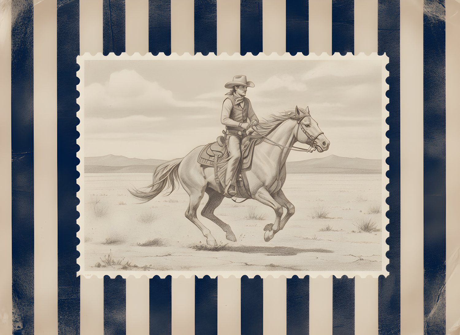 Bring a touch of the Wild West to your space with this captivating navy blue western wall art print. Featuring a classic cowboy riding a horse across a vast desert landscape, this vintage-inspired design captures the essence of rustic adventure and timeless Americana. Perfect for adding a sophisticated yet rugged vibe to your home decor, office, or gallery wall.