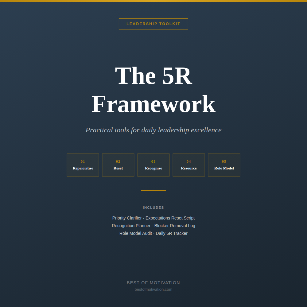 The 5R Leadership Framework is a practical system for daily leadership — five disciplines that keep teams focused, aligned, and performing. This toolkit gives you the templates, scripts, and trackers to implement it immediately.