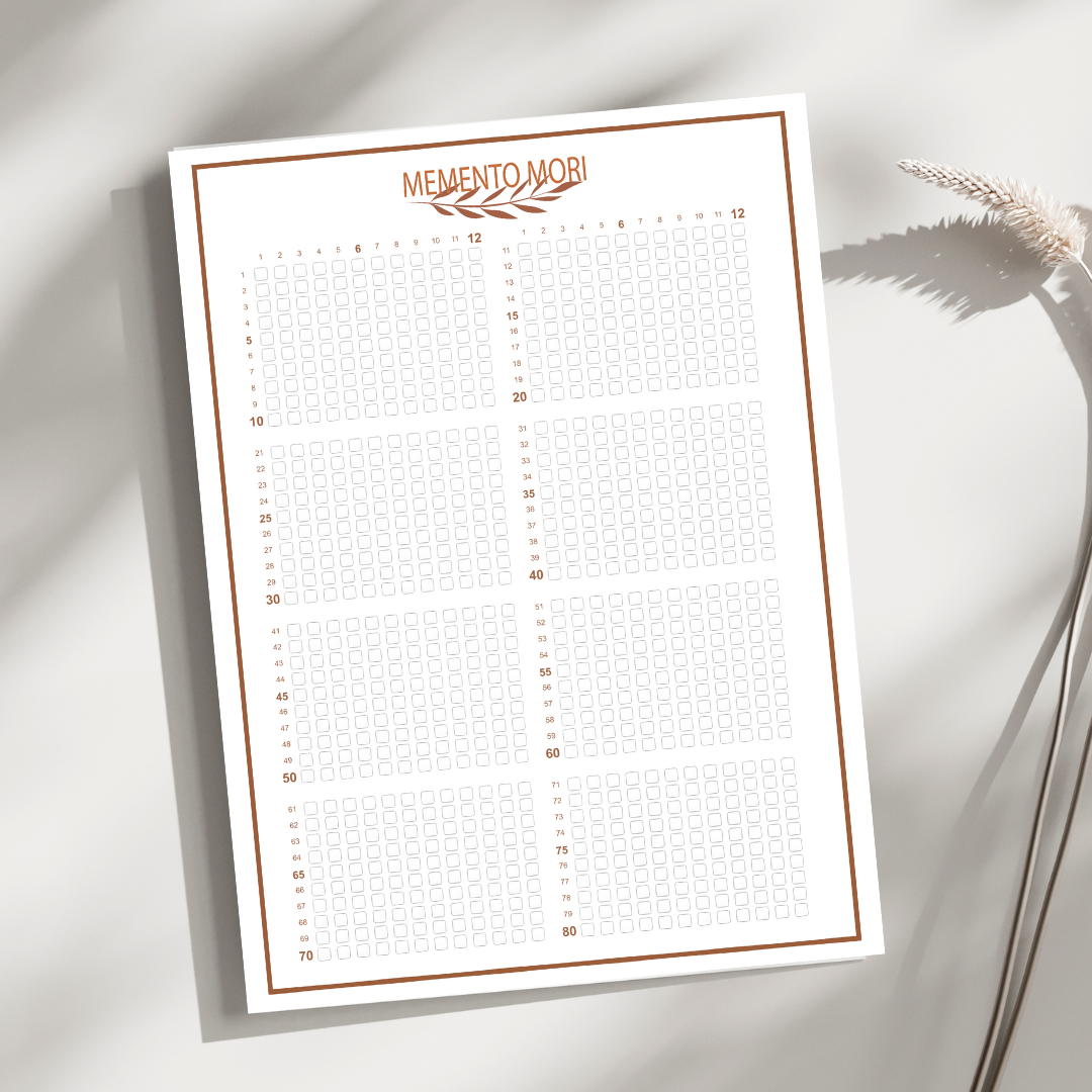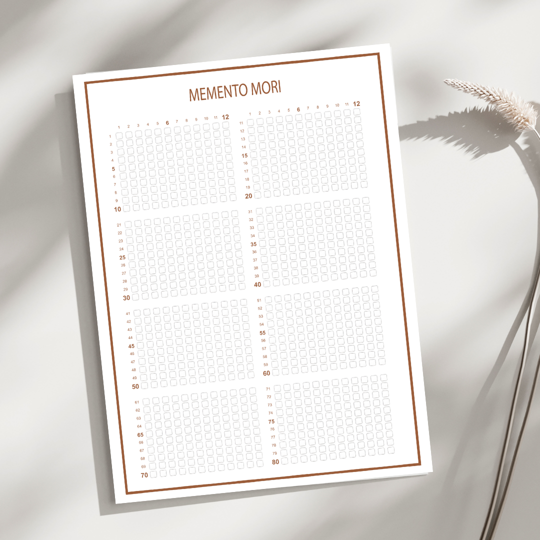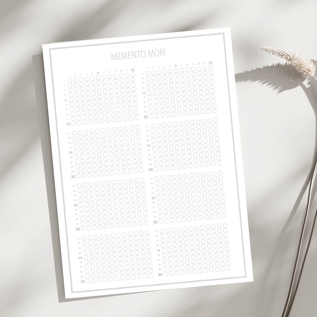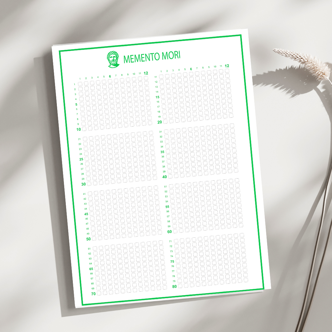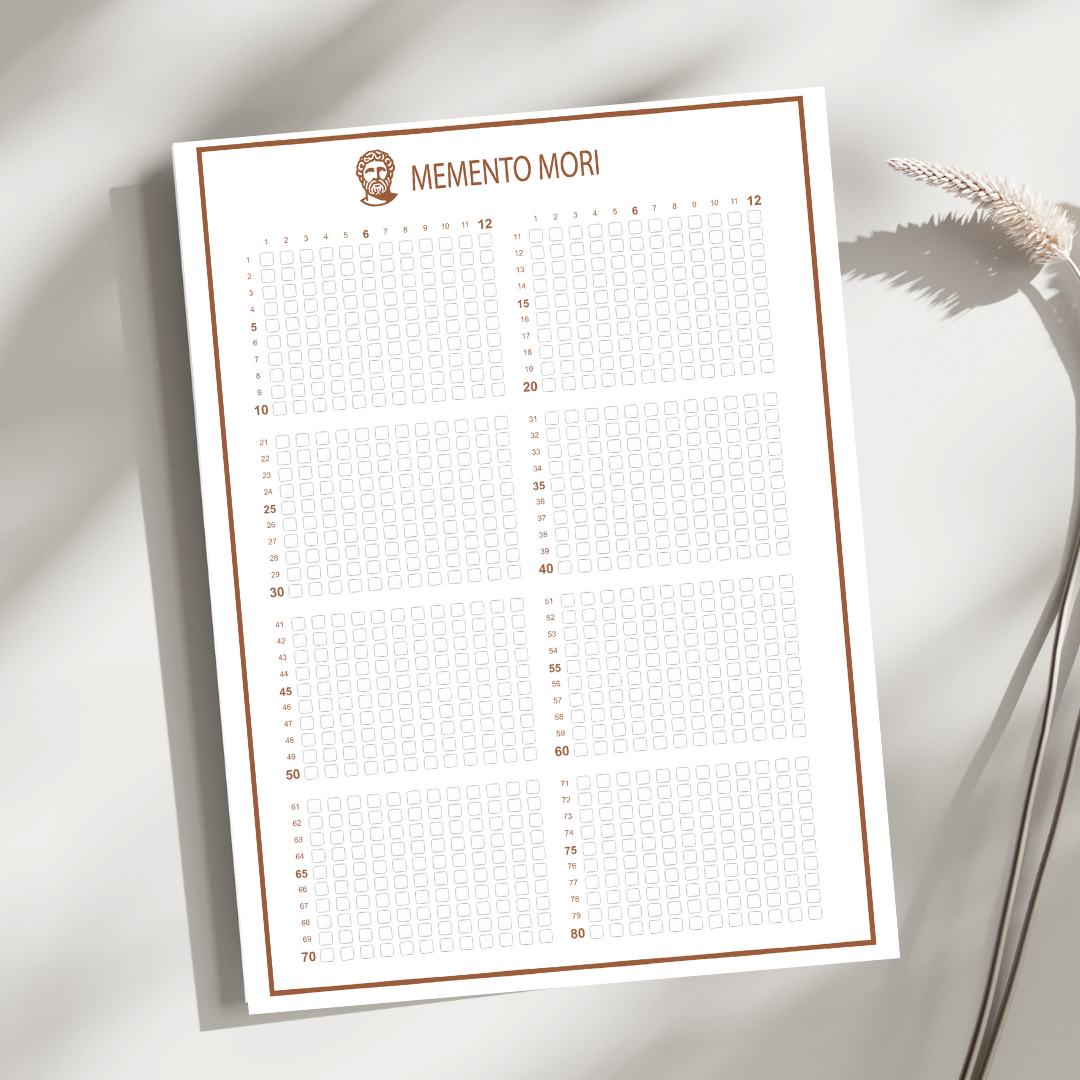 Embrace the wisdom of the Stoics with this printable Memento Mori Life Calendar, designed to give you perspective on how precious your time is. Inspired by the ancient philosophy of "Remember you must die", this visual tracker helps you reflect on life week by week—from birth to age 80.