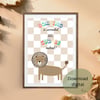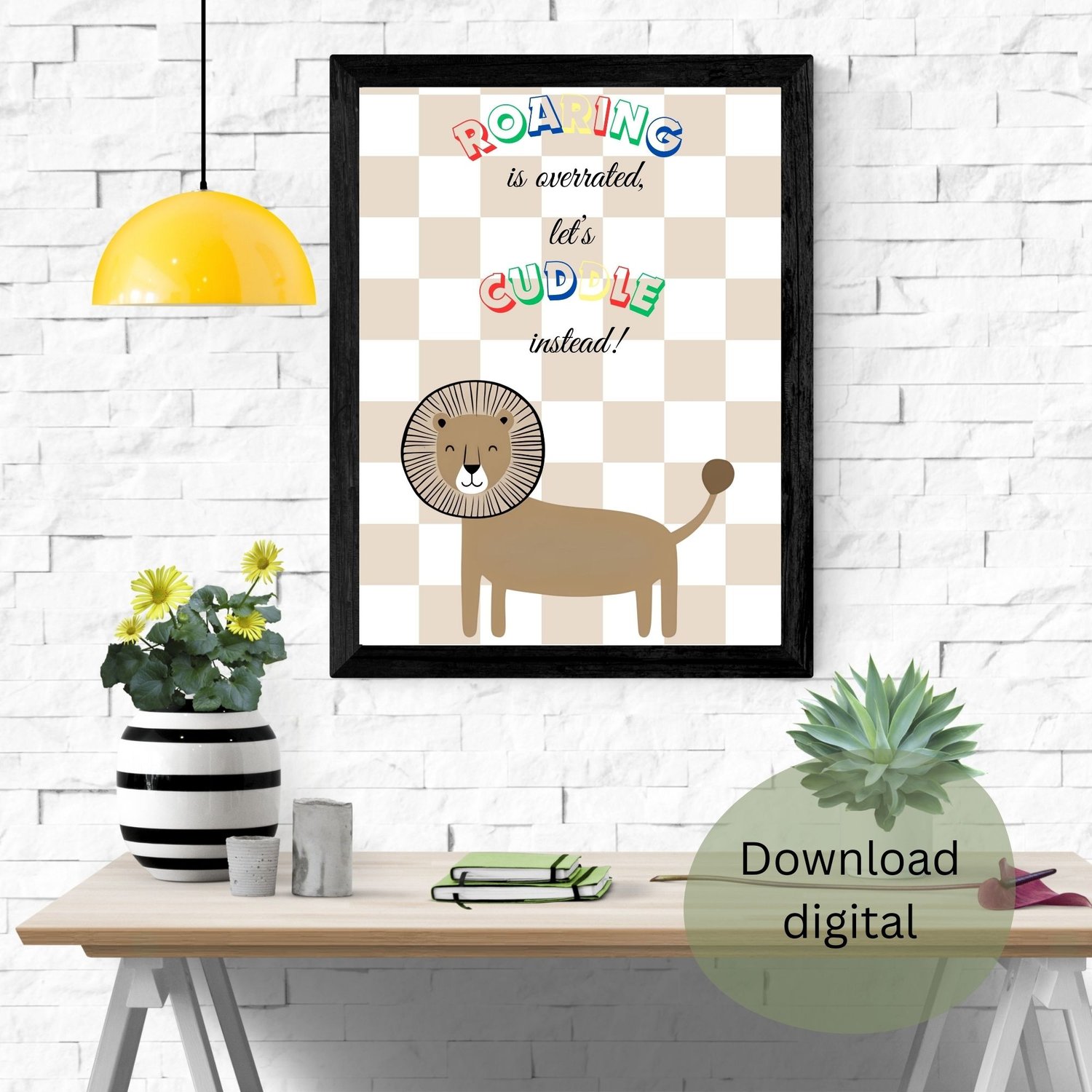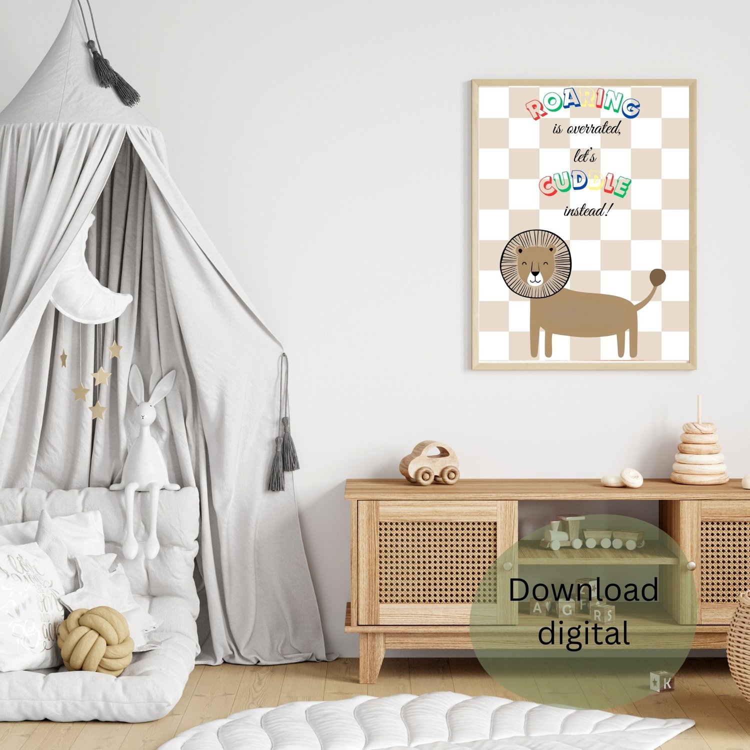 Uma ilustração encantadora de um leão fofo e minimalista com um fundo xadrez em tons neutros. O leão sorri de forma simpática, transmitindo uma sensação de aconchego e doçura. Acima dele, a frase divertida 'Roaring is overrated, let’s cuddle instead!' adiciona um toque de humor e carinho. Com um design lúdico e cores suaves, esta arte é perfeita para decorar quartos infantis, trazendo uma atmosfera acolhedora e alegre
