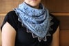 An oversized cowl, with a bandana tip, it features an easy to memorize, repetitive lace pattern, making it a great intro to lace knitting. It starts out worked flat, then switches to being knitted in the round and is finished off with a picked up lace edge in a contrasting color.