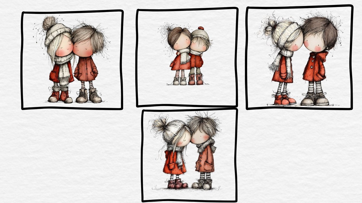 These hand-drawn style, watercolor couples are captured in various loving poses—from a tender kiss to cuddling on a bench—making them ideal for capturing the warmth of love during the colder months.