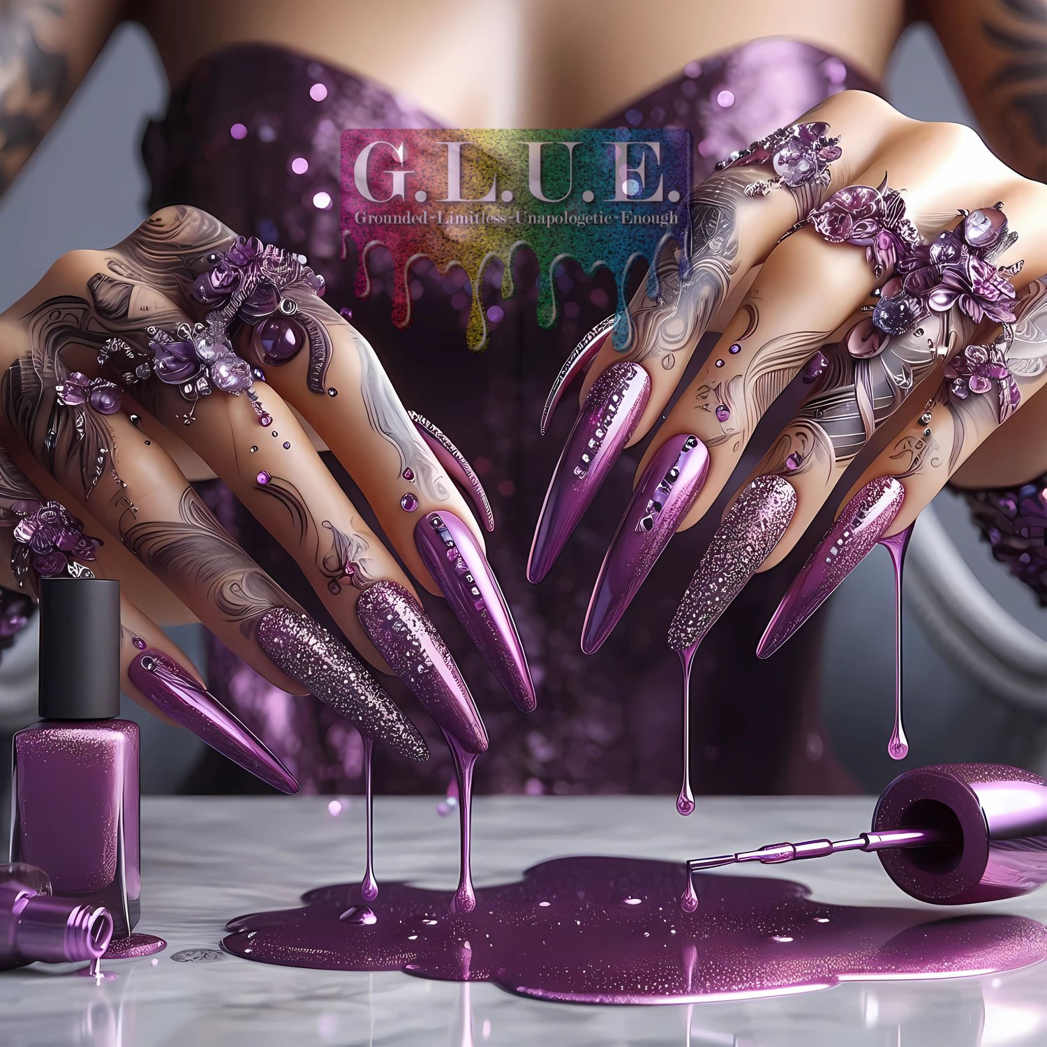 Elevate your projects with this stunning luxury nail art PNG featuring deep purple stiletto nails, gemstone embellishments, and glitter drip details. Perfect for fashion lovers, nail techs, beauty influencers, and entrepreneurs creating flyers, social media posts, T-shirt designs, digital mockups, or brand visuals.