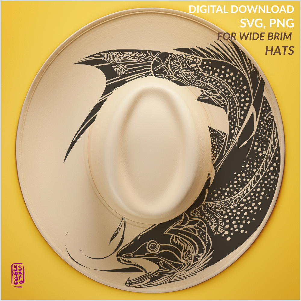 Tags: Fish Engraving SVG, Salmon SVG, Fishing Hat Design, Trout Laser File, Marine Life Art, Laser Engraving File, Hat Engraving SVG, Wide Brim Hat Art, Tribal Fish, Speckled Design, Leather Burning, Digital Download, SVG Cut File