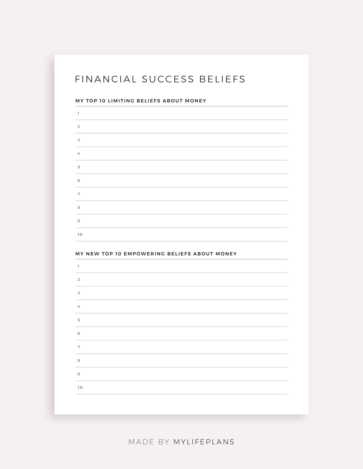 This is a printable financial success beliefs template — just download, print, and start using it right away.