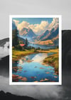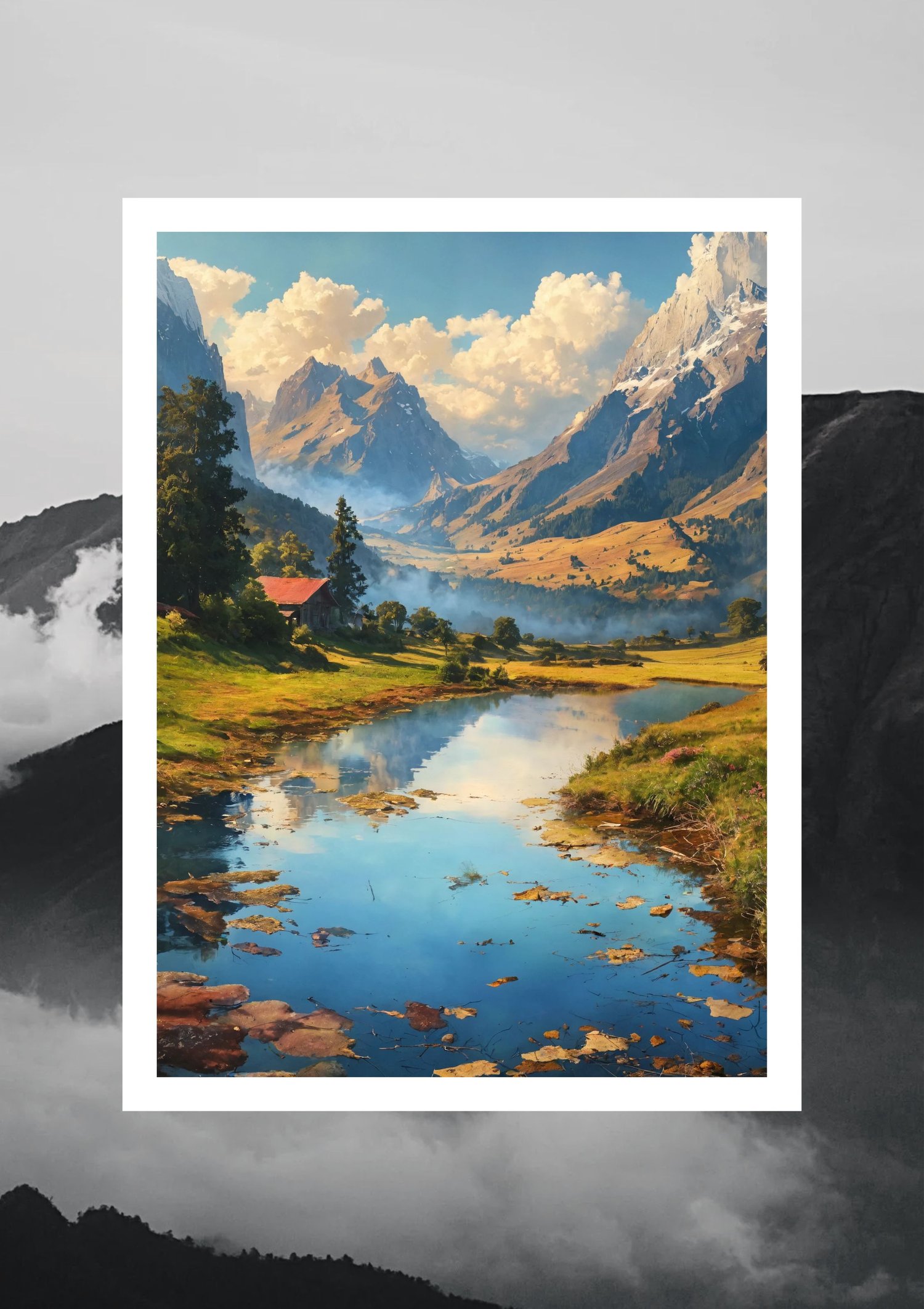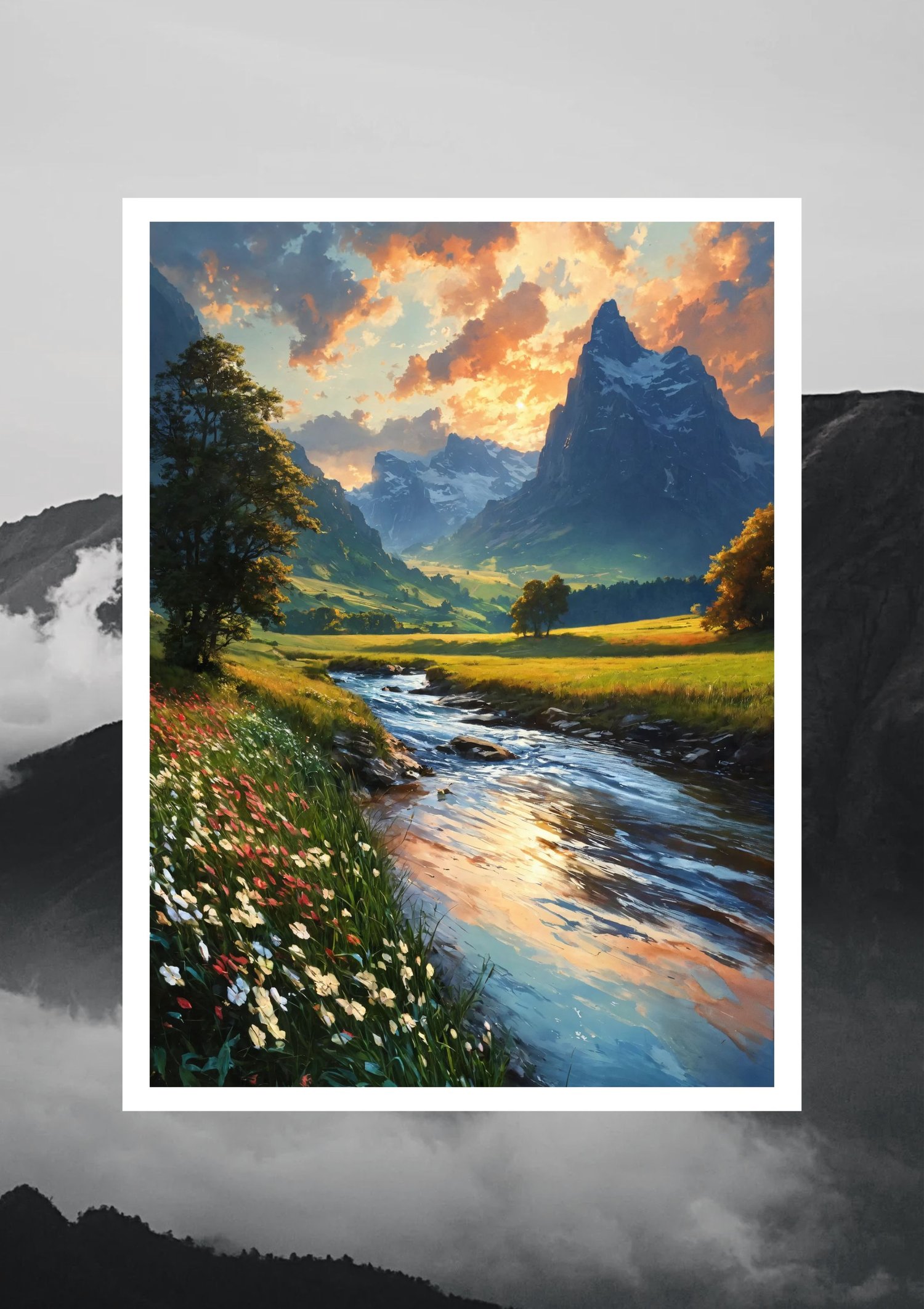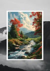 This captivating print captures the beauty of a mountain river flowing through a lush forest. The vibrant autumn colors and dramatic clouds create a sense of awe and wonder.