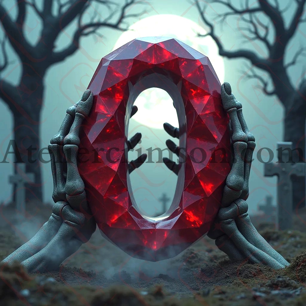 The letter O ruby halloween skull Discover our eerie alphabet series featuring photorealistic ruby letters and numbers. Each character, crafted from deep red gemstone, floats mysteriously in a misty graveyard. Skeletal hands frame these gleaming symbols against a moonlit, Halloween-inspired backdrop. Perfect for gothic design projects or seasonal decor inspiration!