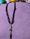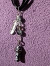 Stone and Glass pendulum ribbon necklace with feather charm
