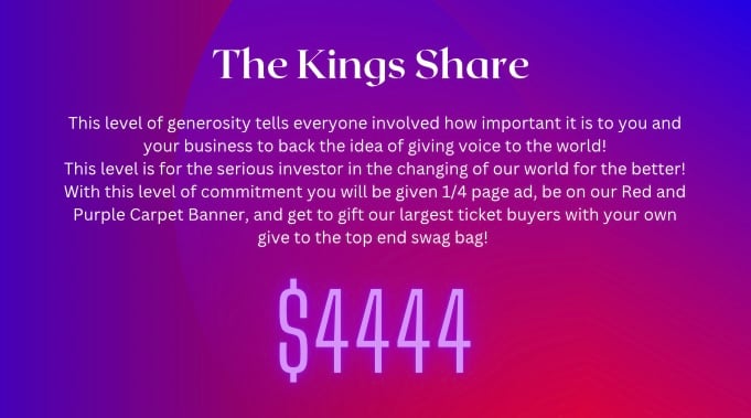With this level of commitment you will be given 1/4 page ad, be on our Red and Purple Carpet Banner, and get to gift our largest ticket buyers with your own unique product or service for the VIP swag bag!