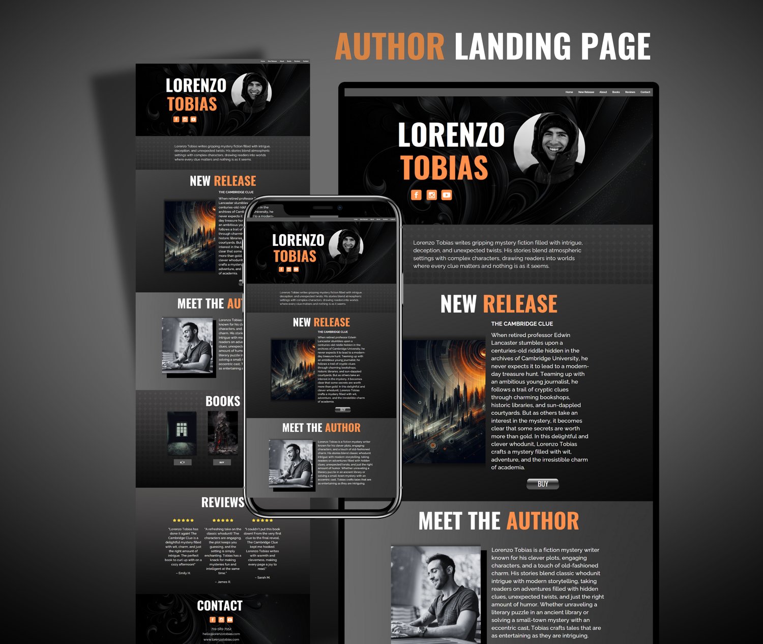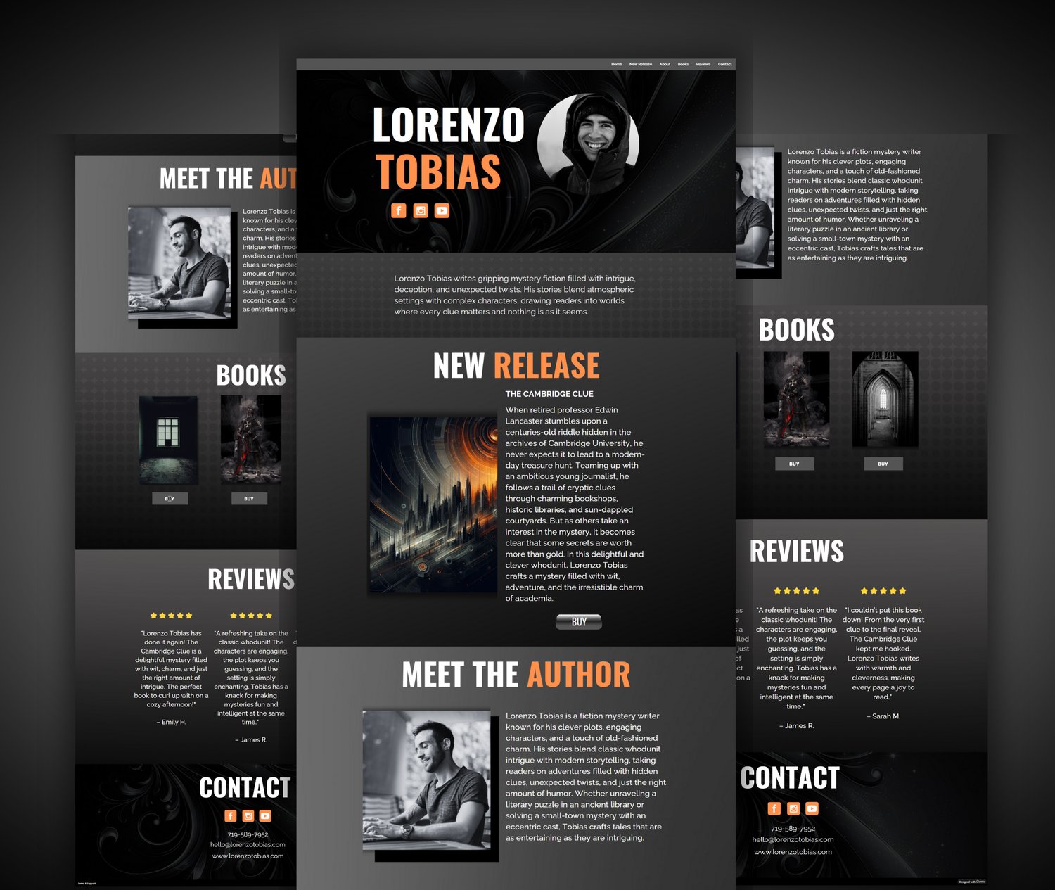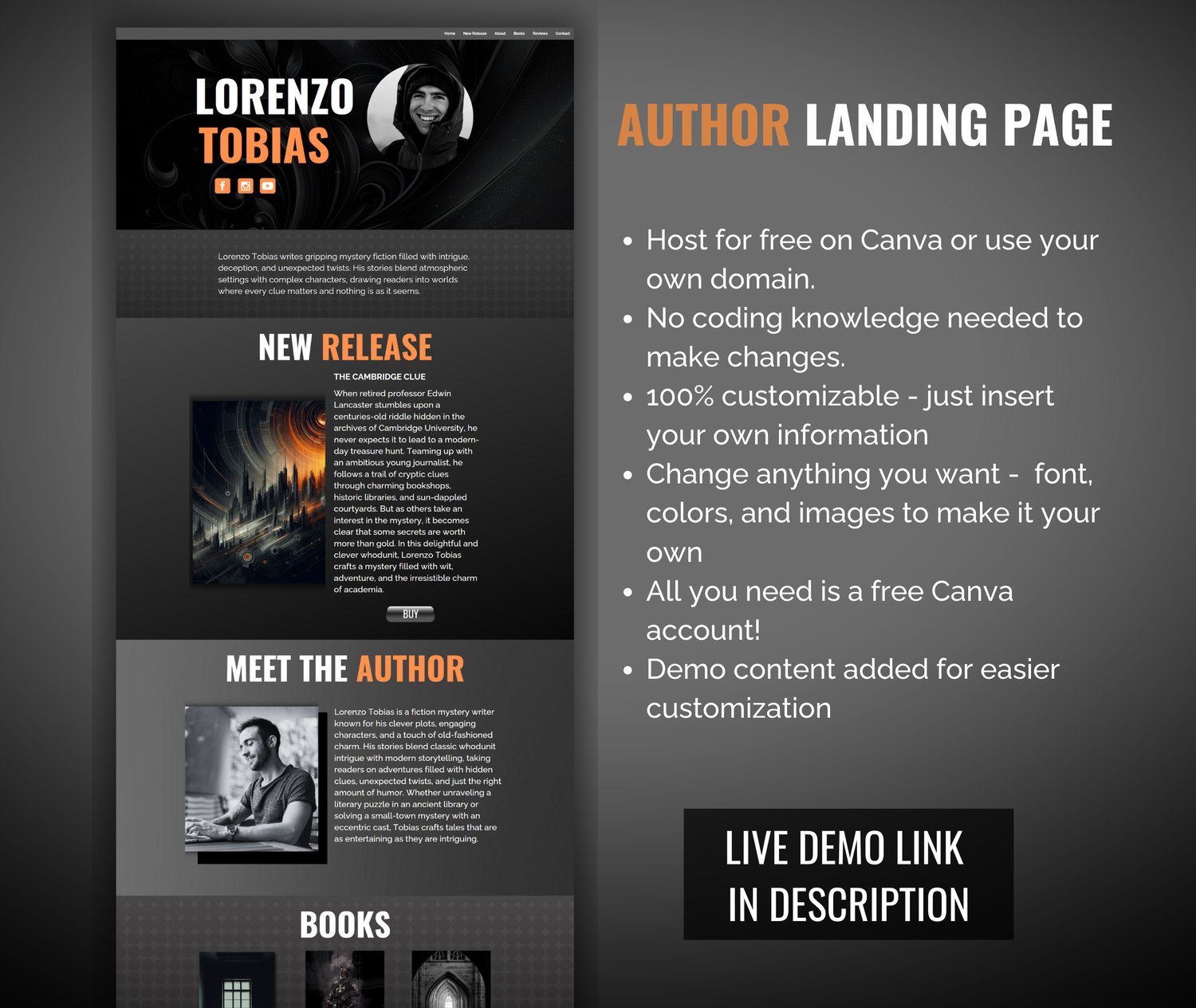 {The Lorenzo) Dark Theme Canva Website Template for Authors - Author Landing Page