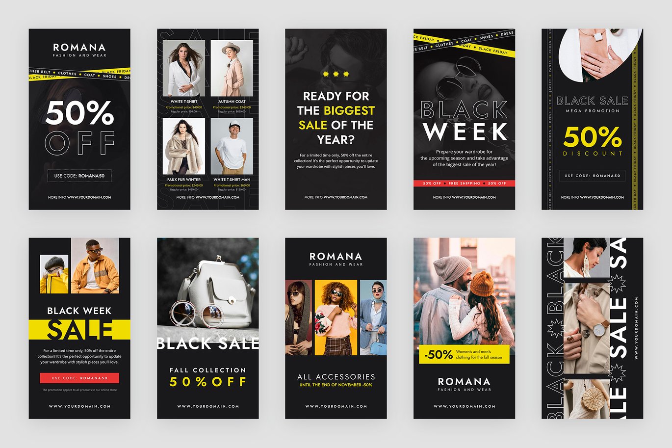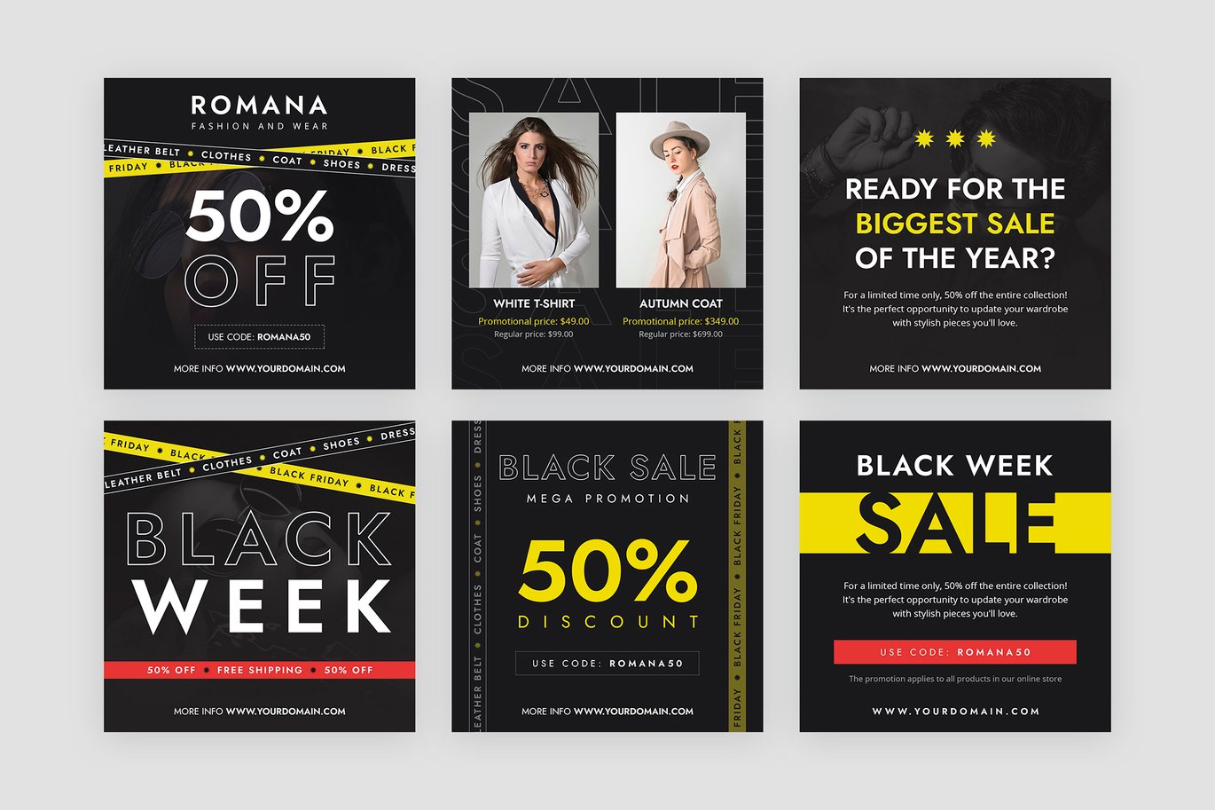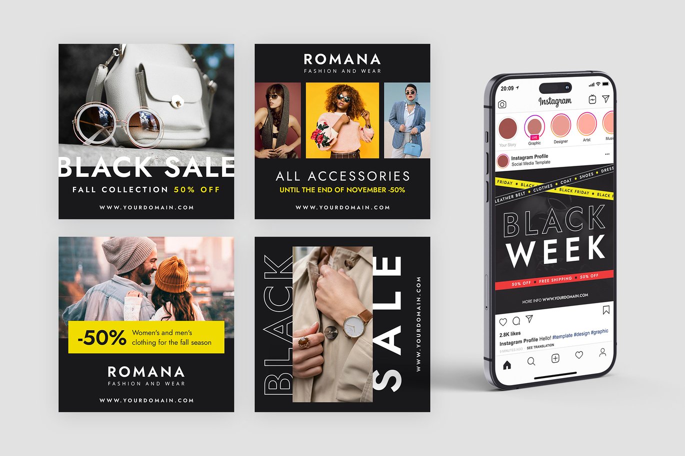 Modèles Instagram Fashion Black Friday – créez un look cohérent et professionnel pour votre profil Instagram, attirez les clients et faites la promotion efficace des occasions spéciales.