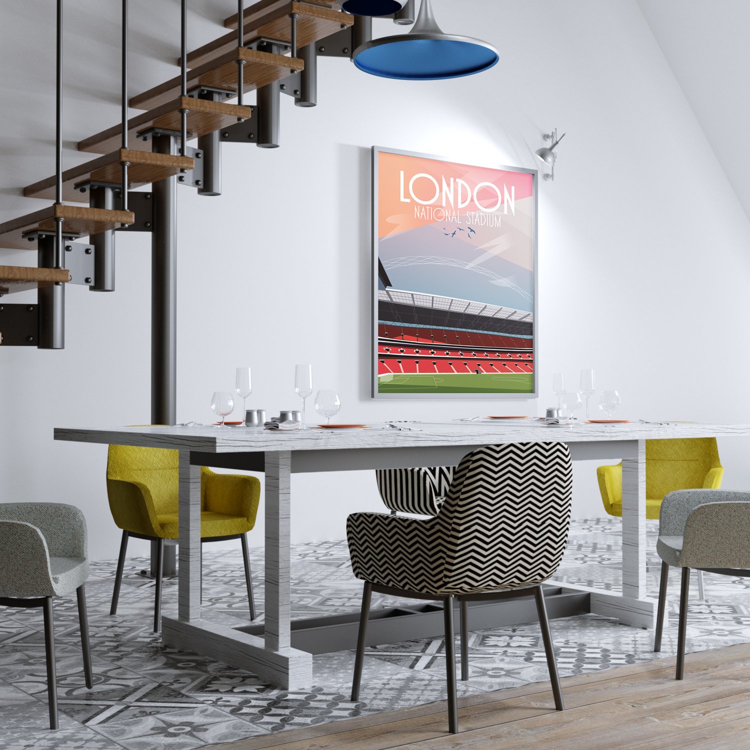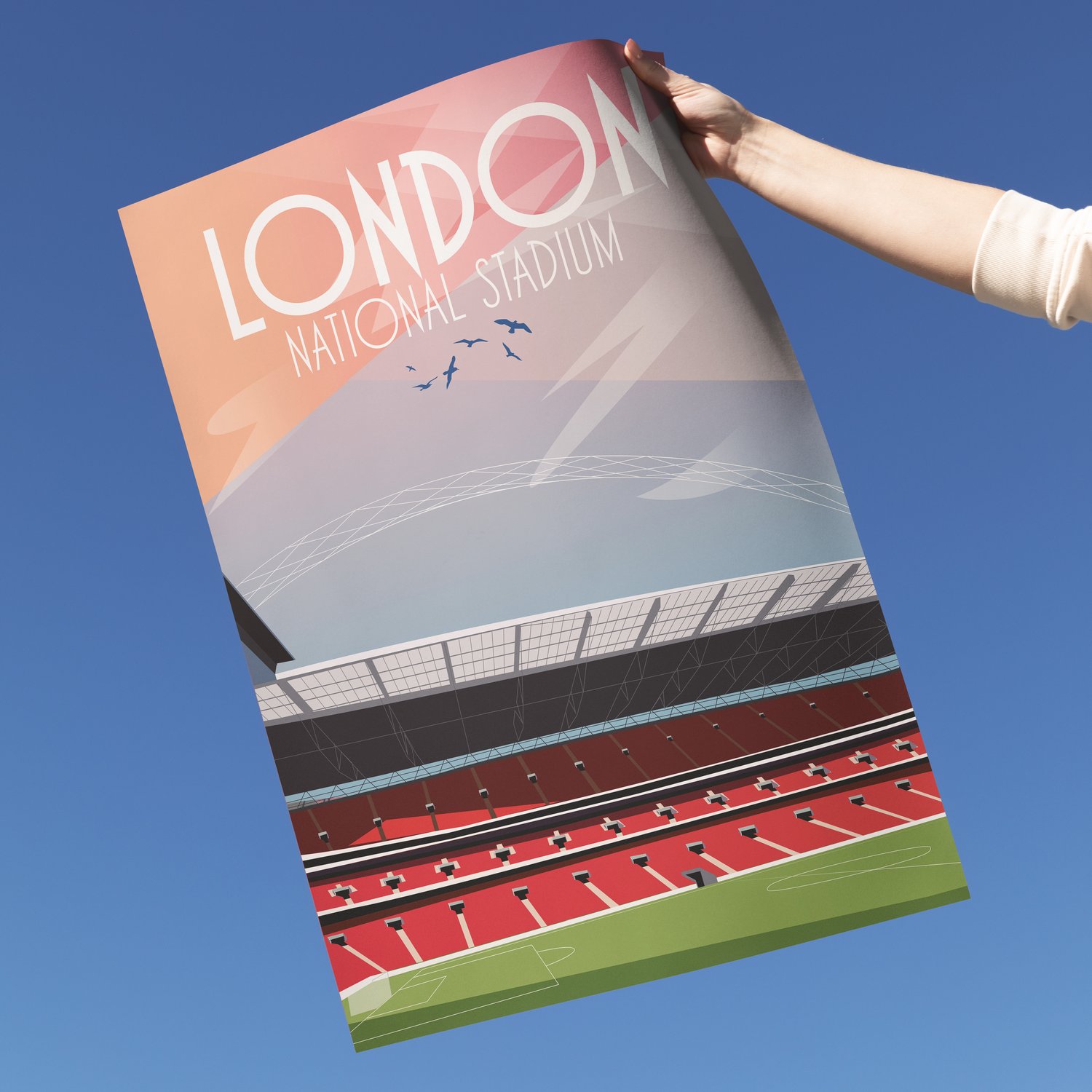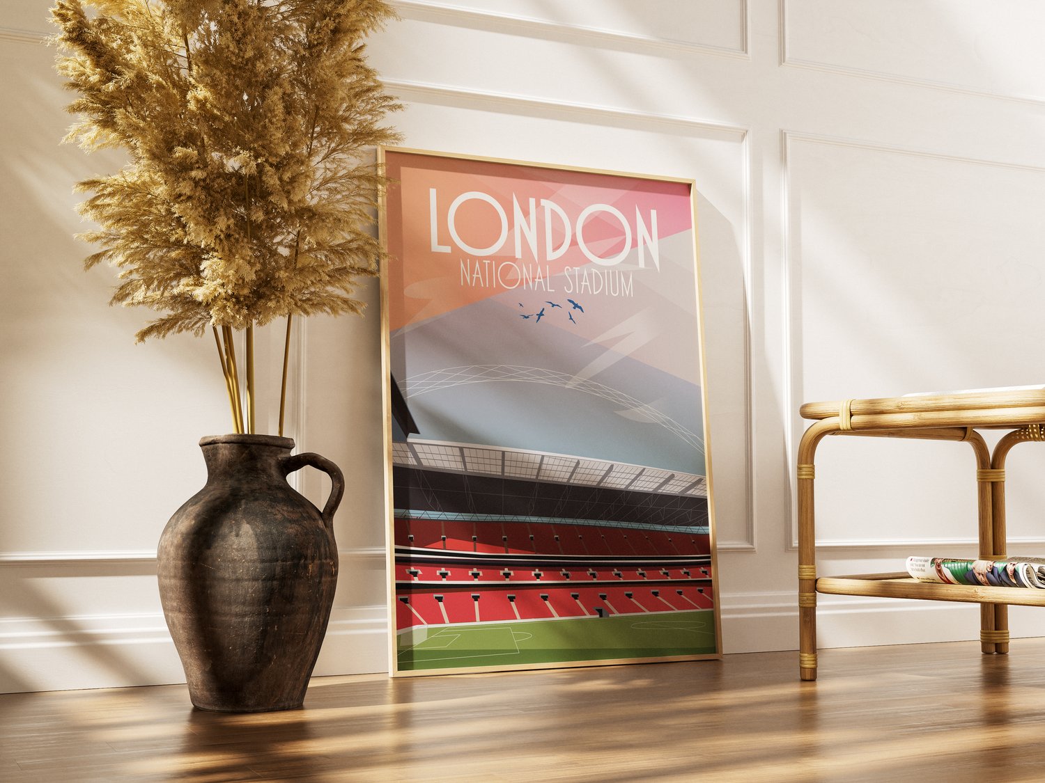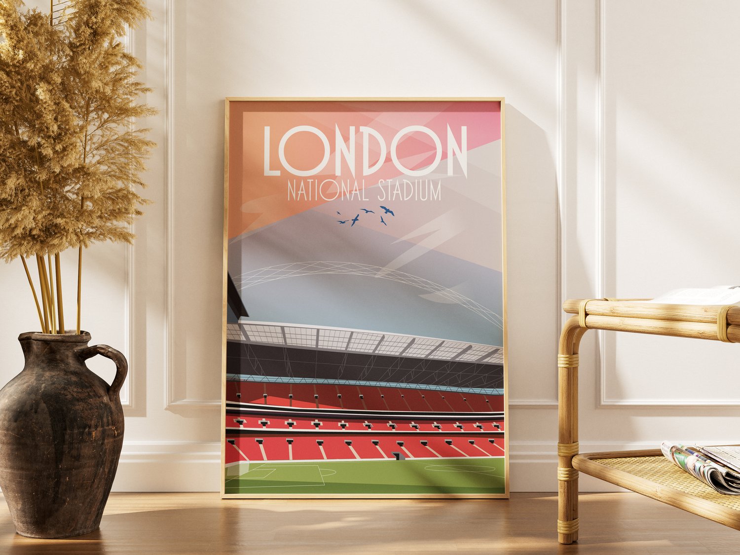 Celebrate the legendary spirit of English football with this dynamic illustrated poster of the iconic Wembley Stadium — London's National Stadium! Perfect for fans, this digital wall art captures the stadium's world-famous arch and sweeping red stands in stunning retro style.