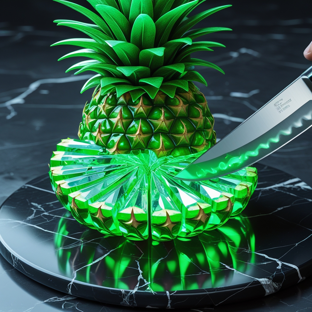 Realistic 4K footage close-up of a knife rapidly cutting a neon green crystal pineapple on a black marble slab. The blade cuts through the whole fruit from top to bottom, breaking it into radiant, glowing slices. The inside of the fruit is also crystal. The sound is ASMR style.