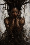 A woman stands in stillness, eyes closed, her body rising through dark, winding roots. They lift through her hair, trace her arms, and extend downward — not as burden, but as foundation. She is not restrained. She is supported.