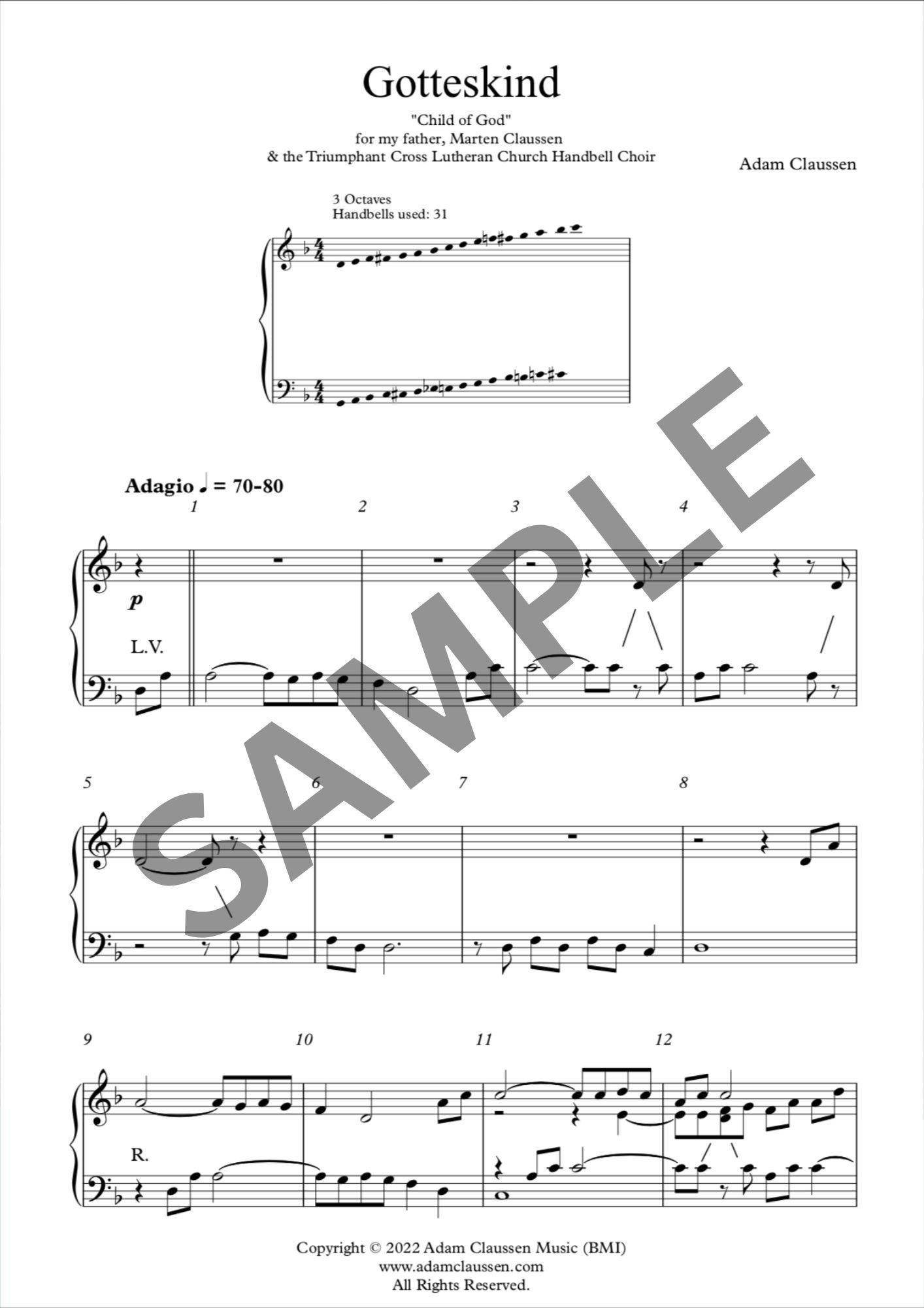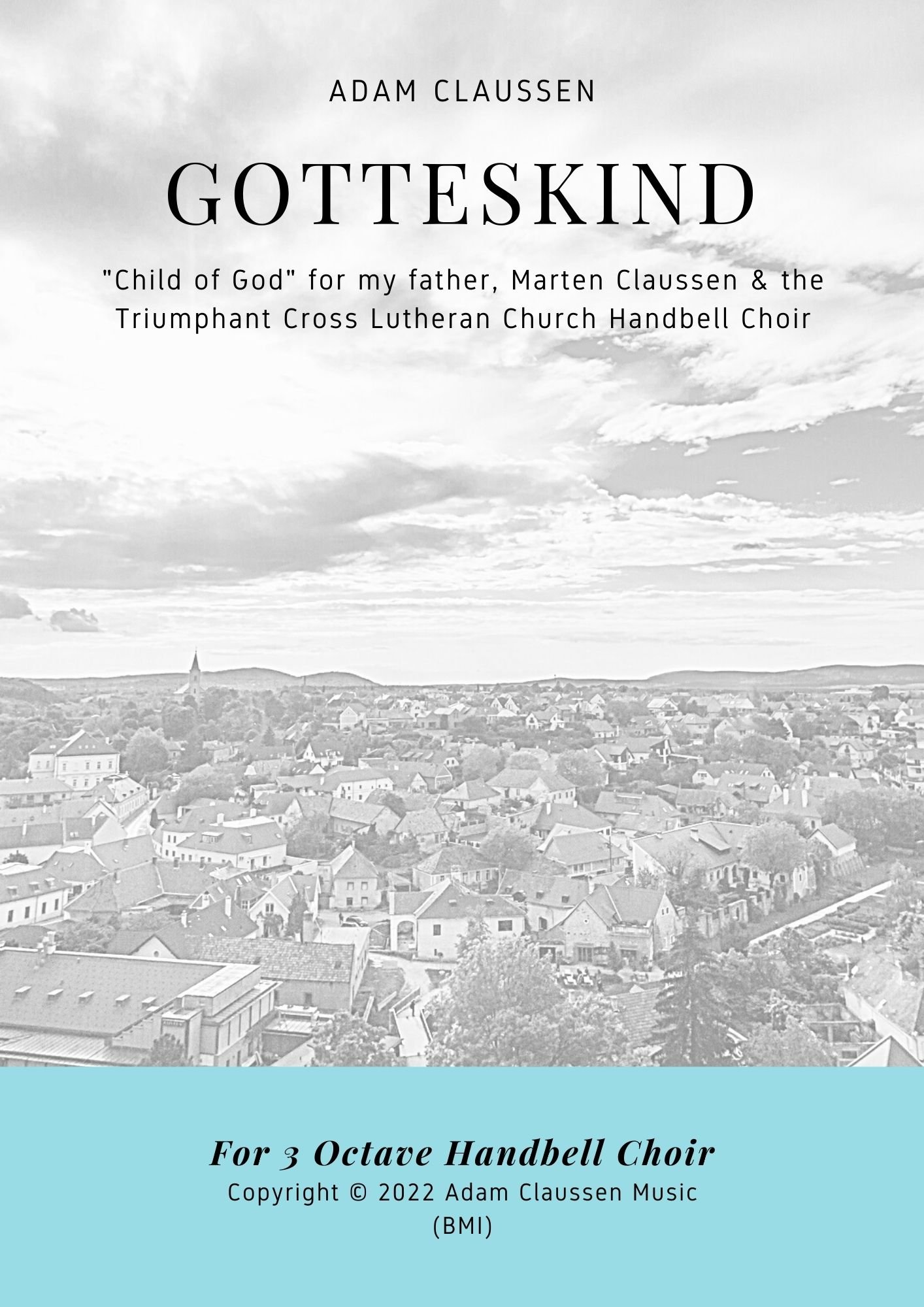 When I was growing up in New Hampshire, I remember my dad used to sing a song every Sunday morning when he was in a particularly upbeat mood. Improvisatory in nature, it always contained the same core melody, and felt very much like a church hymn. As a Christmas gift to him in 2020, I decided to transcribe and arrange this piece for our family's church handbell choir, under the title "Gotteskind", or "Child of God". Since then, the piece has seen several performances from Florida to New Hampshire, and both my father and I are pleased that it seems to have struck a chord (pun intended) with handbell groups and congregations across the US.