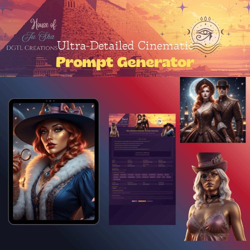 Transform your creative workflow with this fillable AI prompt generator—designed to help you produce hyper-realistic, 8K cinematic portraits inspired by luxury fashion, haute couture hats, bold accessories, and rich artistic textures. Whether you're designing for clients, crafting your next art collection, or elevating your digital products, this generator produces jaw-dropping results every time.