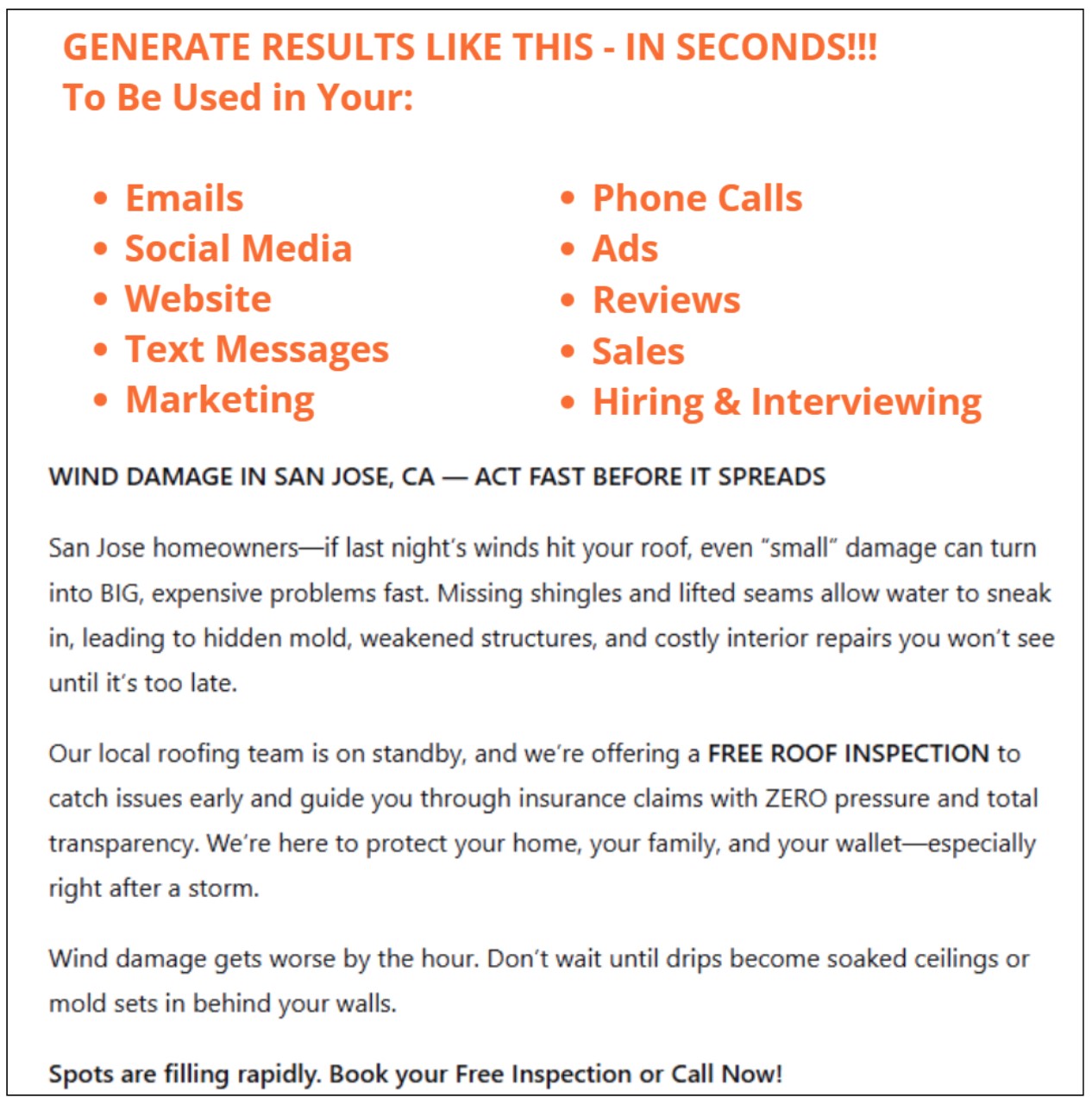 "This Engine is insane. I copied, pasted, and had a geo-targeted Facebook ad running within 5 minutes of a hail storm hitting. We generated 7 qualified leads before our competitors even knew what hit them. That's easily $20,000+ in potential revenue from one formula. Game-changer doesn't even begin to cover it.”