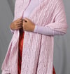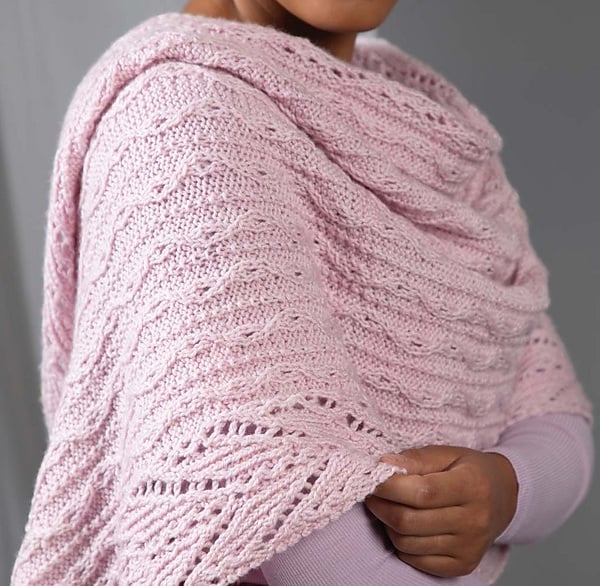 This Stole is worked in a luxe blend of Merino wool and nettle, a plant fiber similar to linen which has a silky-soft hand in this yarn. A large field of cabled lace on a background of garter stitch is framed by dramatic peaks of openwork and twisted stitches. The overall effect is delicate, feminine, and captivating.