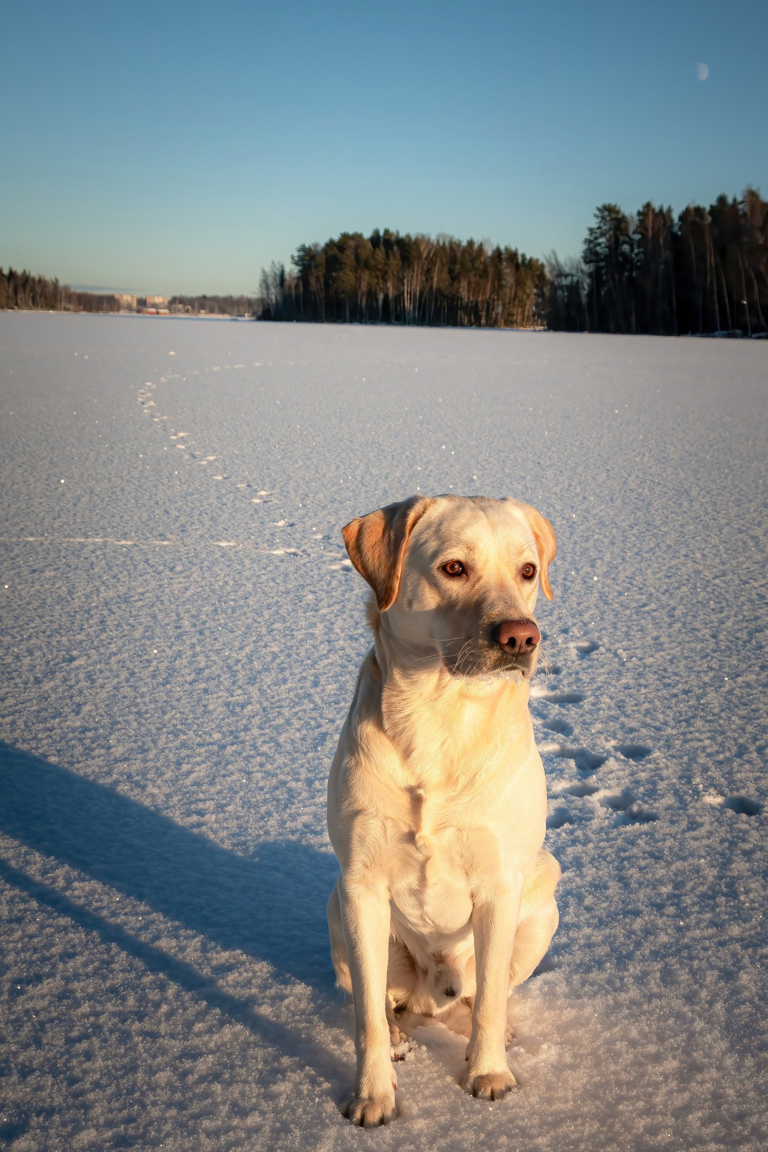 Labrador retriever on the ice of lake. White snow is shining all around.