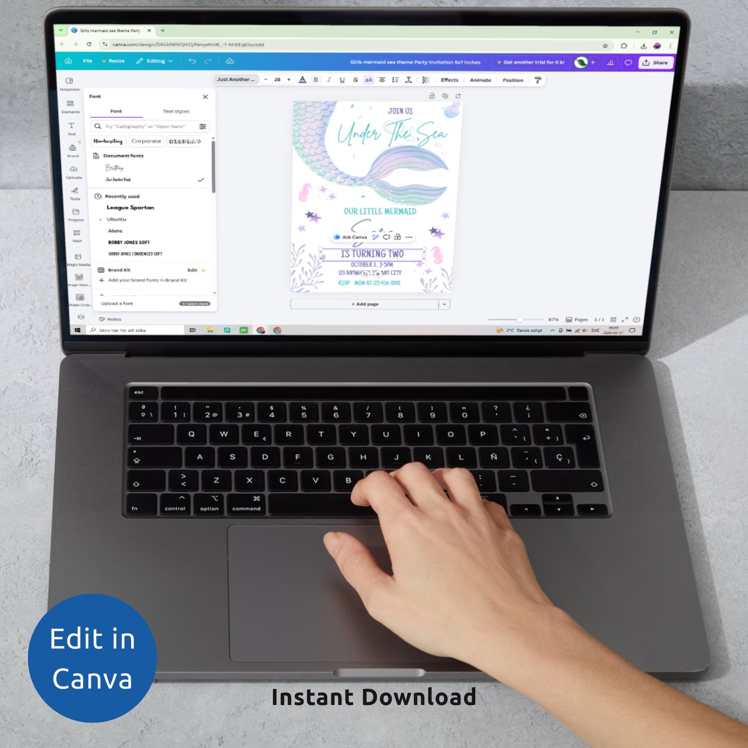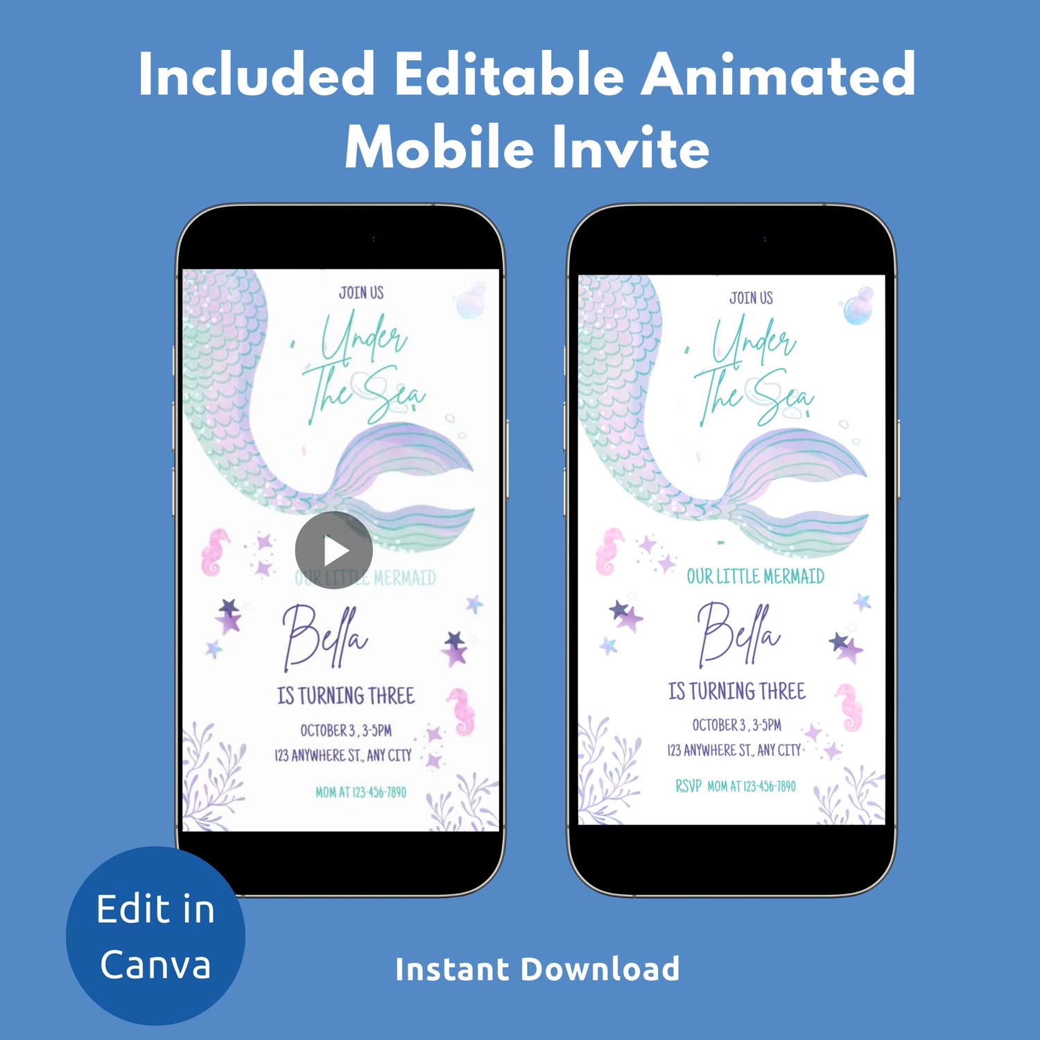 Mermaid Birthday Invitation Template | Under the Sea Girls Party Invite | Editable Canva Kids Birthday Evite | Digital Phone Invitation | Printable or Digital invite