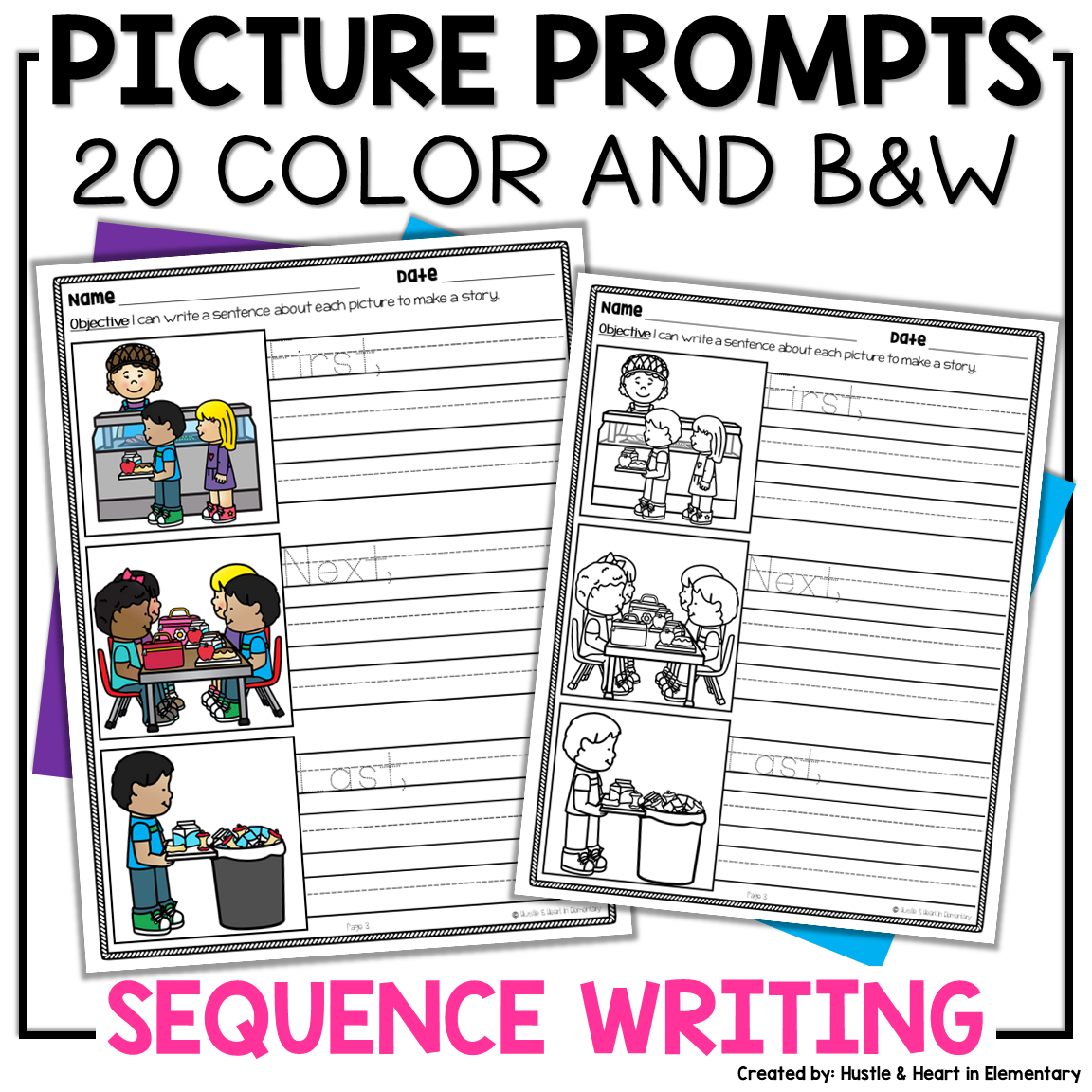 This is a must have writing resource for Kindergarten and First Grade! Students build sentence writing skills while reinforcing the use of transition/sequence words. Perfect prep for Arizona's AZELLA Stage I Kinder test with 20 color and 20 ink saving black and white picture prompts. Equally perfect for use with Narrative writing and Informational How-to writing.