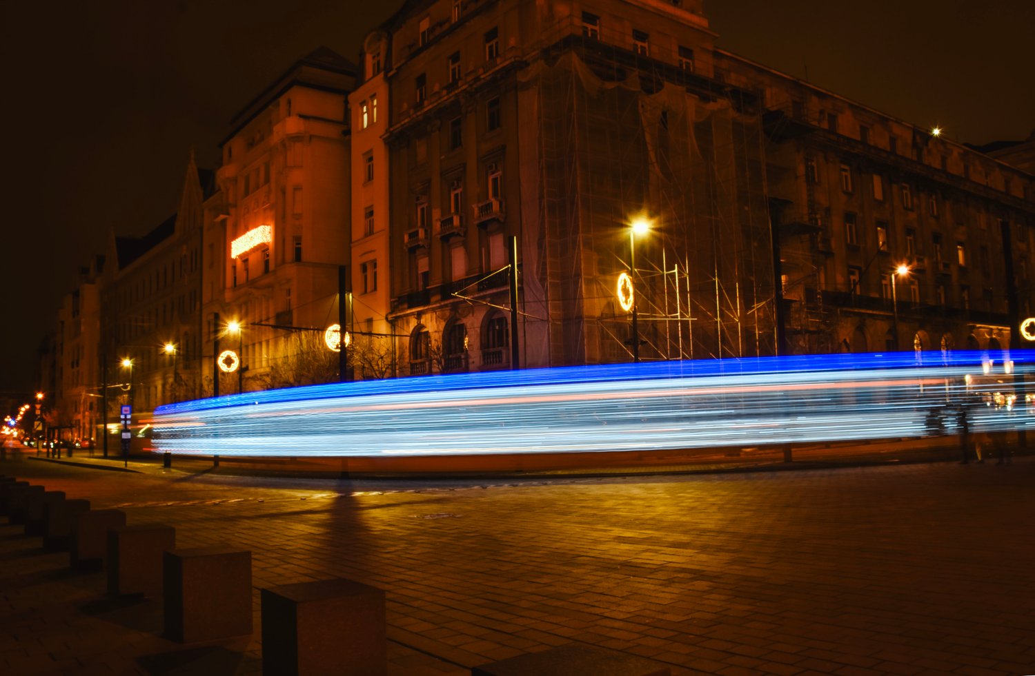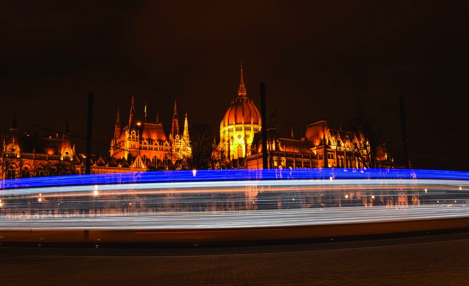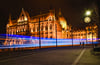 Light Trail Tram in Front of the Hungarian Parliament at Night