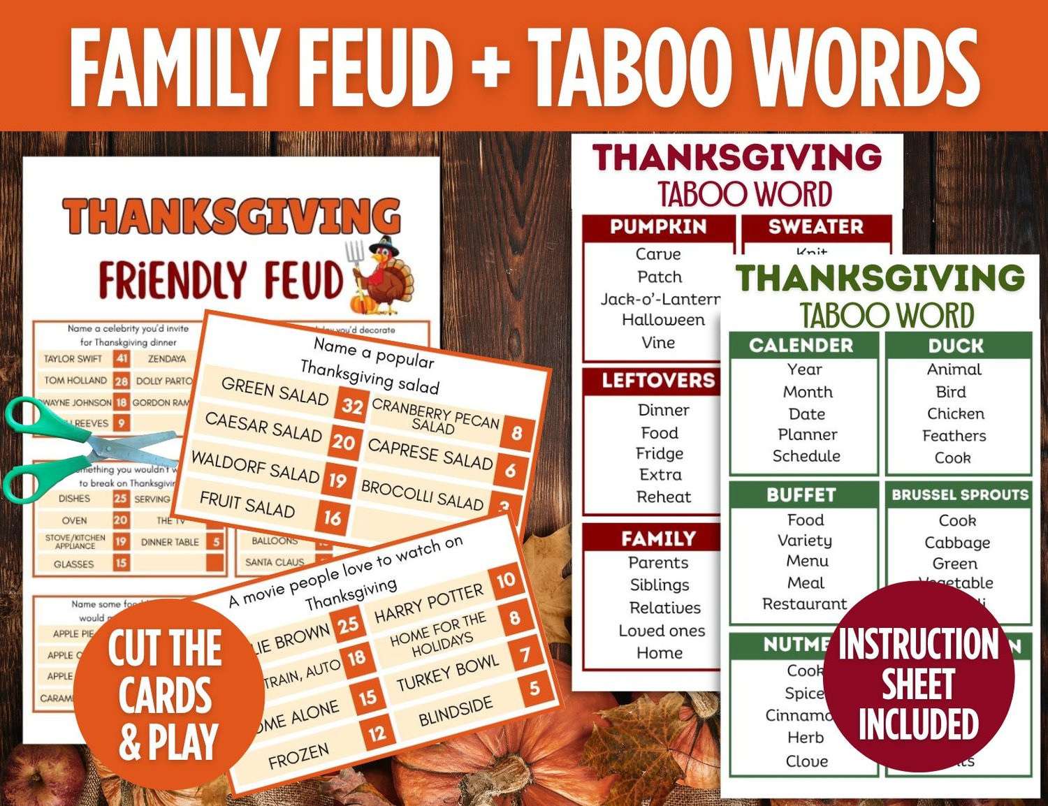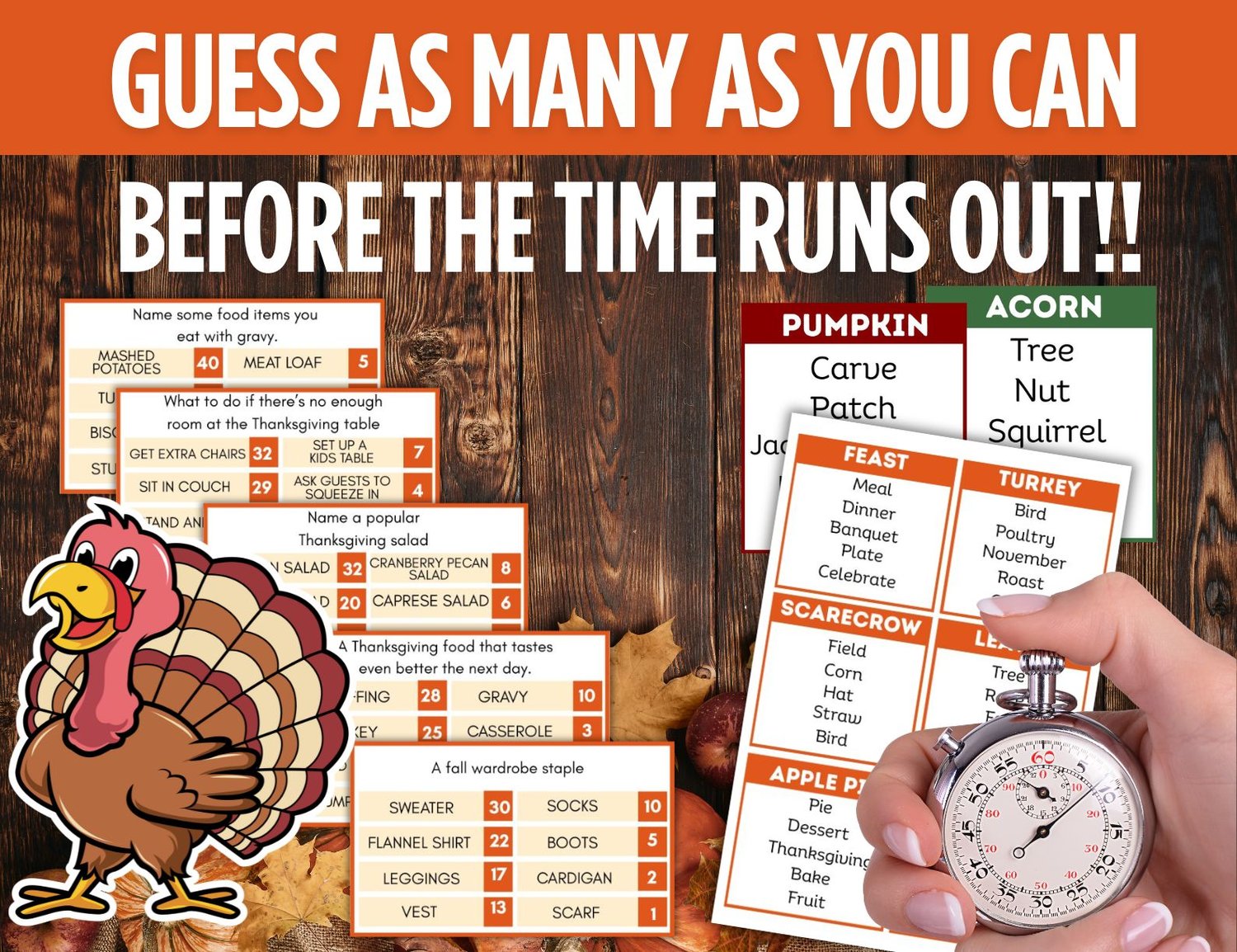 Play this hilarious game of Thanksgiving Friendly Feud with your friends, family, co-workers! This game is played with 2 opposing teams and a Host. The goal is to guess the most common answers to the questions - all centered around Thanksgiving and fall. This printable game features 100 Thanksgiving and fall-themed Questions.