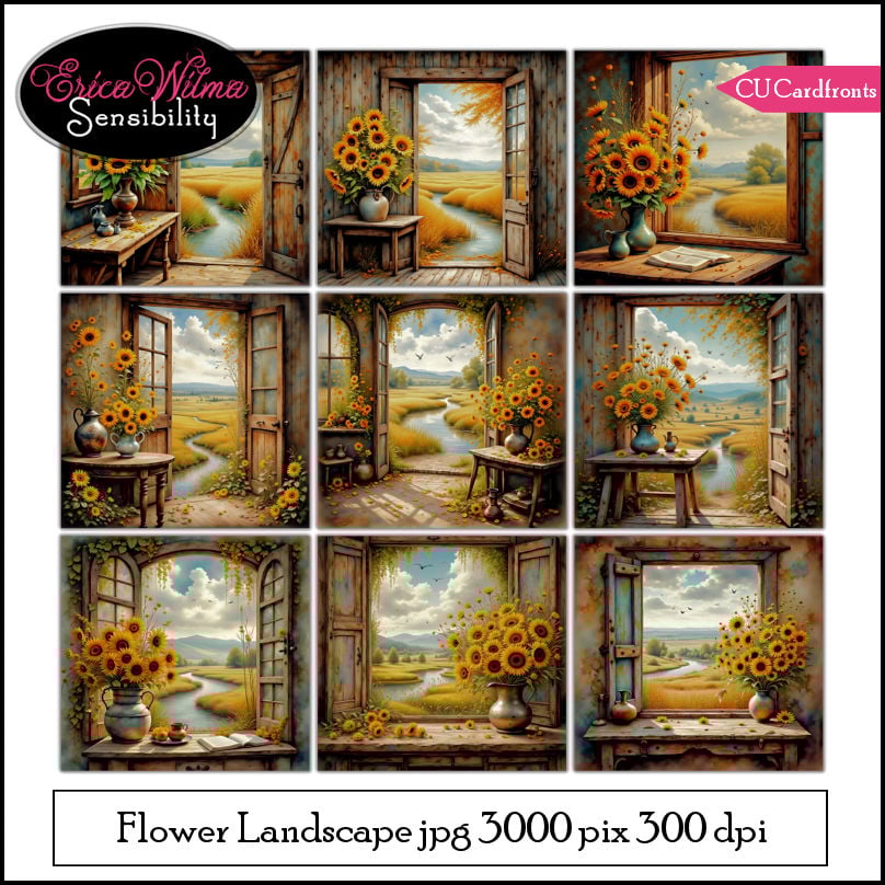 Bring the beauty of nature into your creative projects with this enchanting collection of 9 flower landscape card fronts. Each design features stunning countryside views framed by rustic windows, with vibrant sunflowers and golden fields that radiate warmth and tranquility.