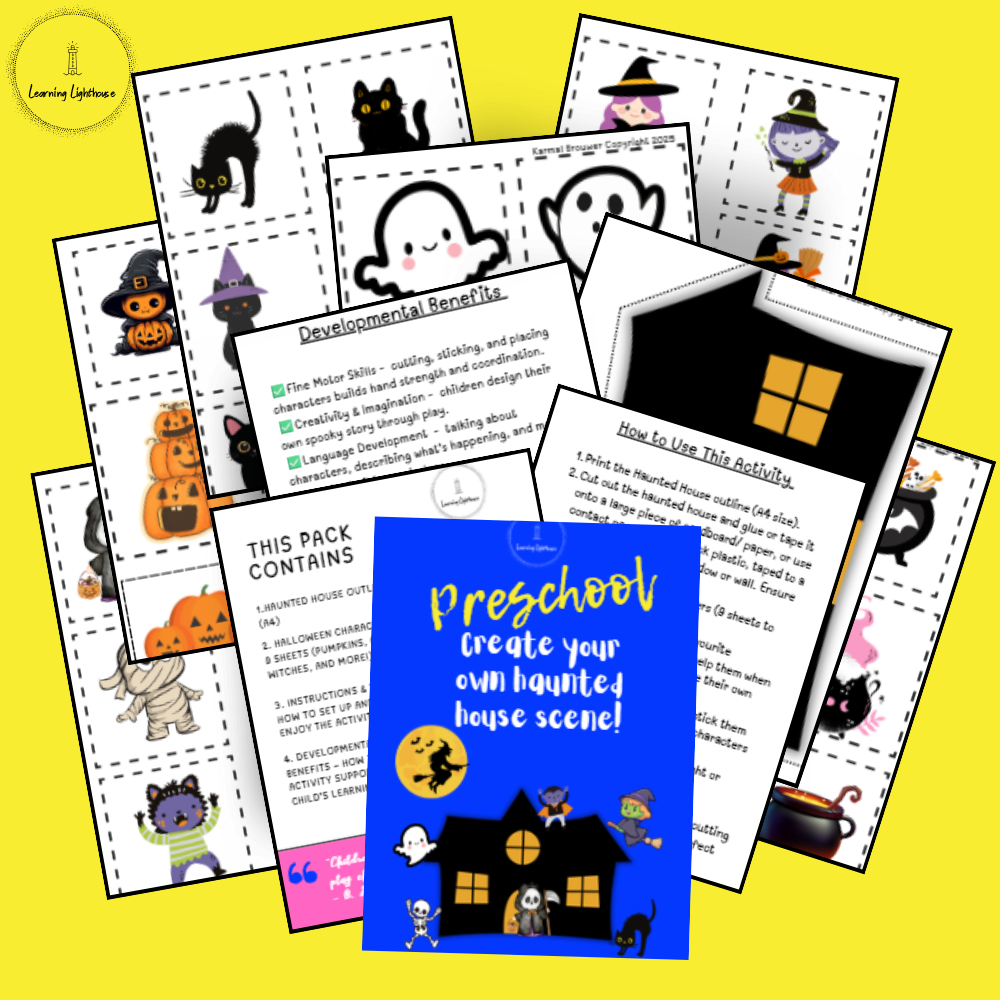 A creative cut-and-paste activity where your child designs their very own haunted house! Perfect for sparking imagination, developing spatial awareness, and encouraging storytelling play.