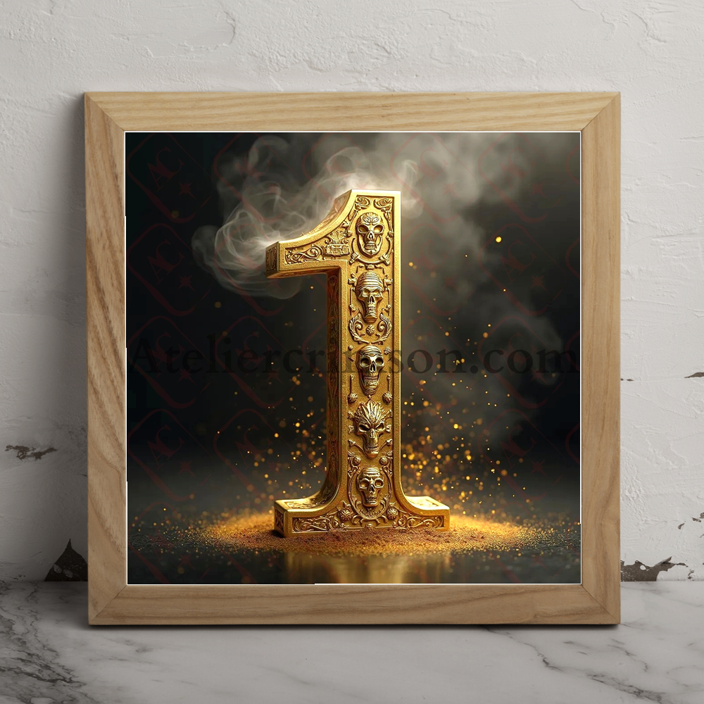 Number 1 gold maya skull Skull-inspired engravings, hyper-realistic rendering. Mystical atmosphere with subtle smoke effects. Perfect for high-end typography and design projects. GoldTypography LuxuryDesign SkullArt"