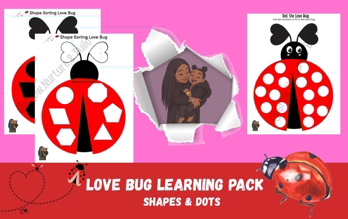 This printable includes two hands-on Love Bug activities—a shape sorting activity and a dot marker worksheet—perfect for building early learning skills through play. Use Velcro, laminate, glue, dot markers, or simple placement to fit your child’s learning style.