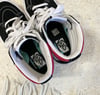 VANS Future Standard ComfyCush Sk8-Hi black suede with red and white fabric high top sneakers.
