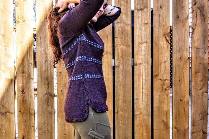 Nain is a top-down raglan with a cowl neck and A-line shaping in the body. The cuffs and hem are split and finished with an edging formed by a cable that continues from the sleeve and side seams.