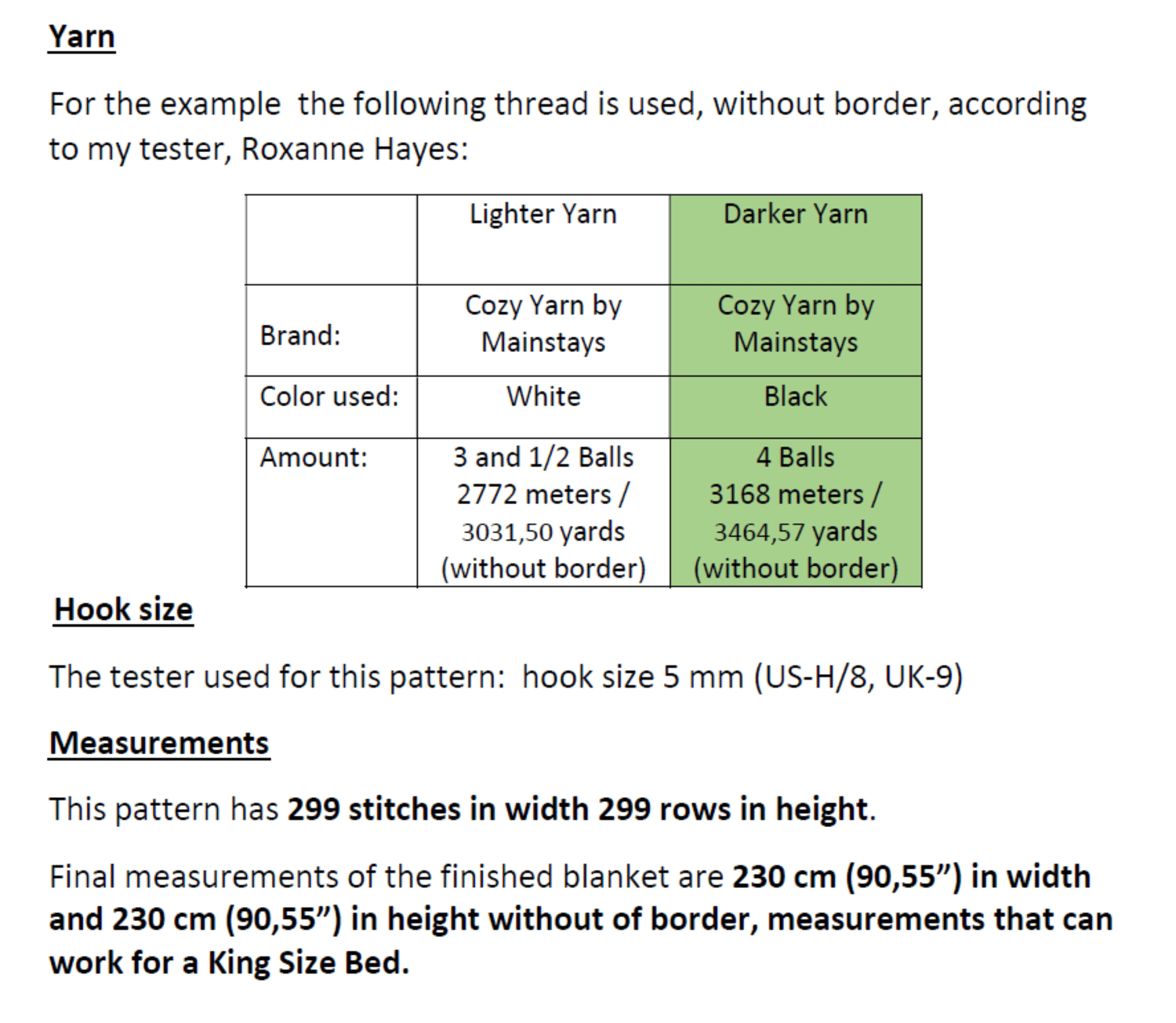 For this pattern, my tester Roxanne Hayes used a 5 mm hook (US = H-8, UK = 9) and the measurements with the recommended yarn were 230 cm (90,55”) in width and 230 cm (90,55”) in height without the border, measurements that can work for a King Size Bed.