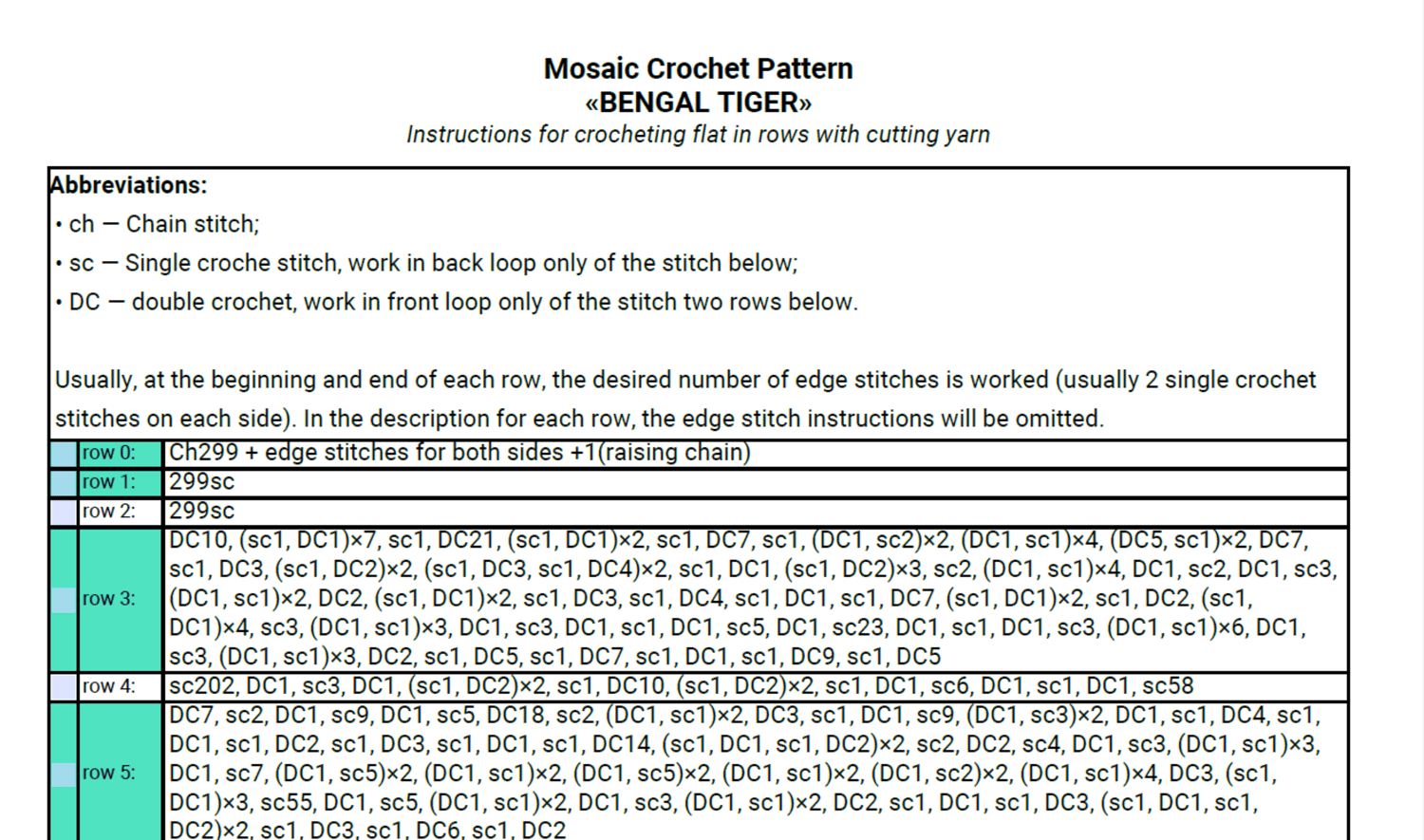 - Written pattern, row by row in PDF