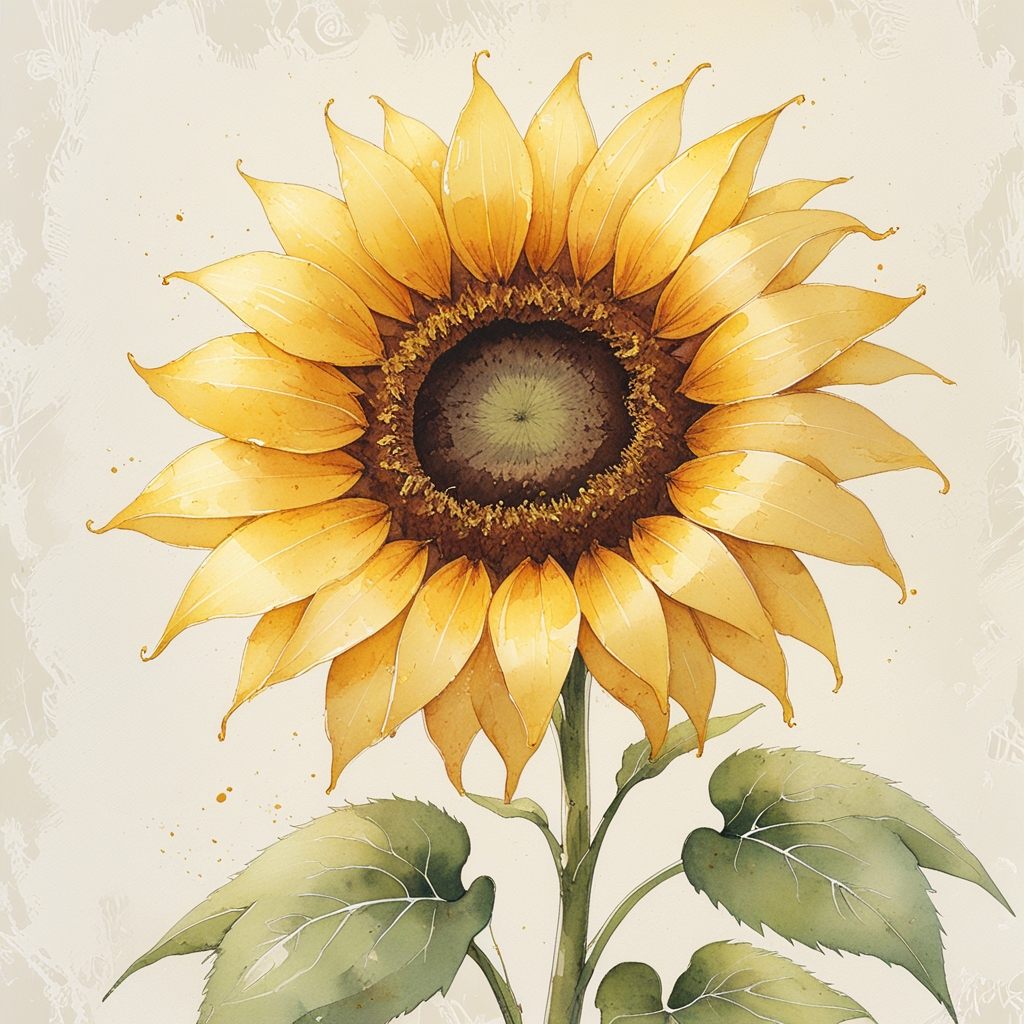 A whimsical, dreamy watercolor painting of a bright yellow sunflower with dark brown center and delicate, velvety petals, set against a soft, creamy white background, evoking a nostalgic, retro feel with subtle texture and gentle, feathery brushstrokes, reminiscent of a vintage botanical illustration, with the sunflower's stem and leaves subtly hinted at in gentle, earthy tones, and the overall atmosphere exuding warmth, happiness, and a touch of old-world charm.