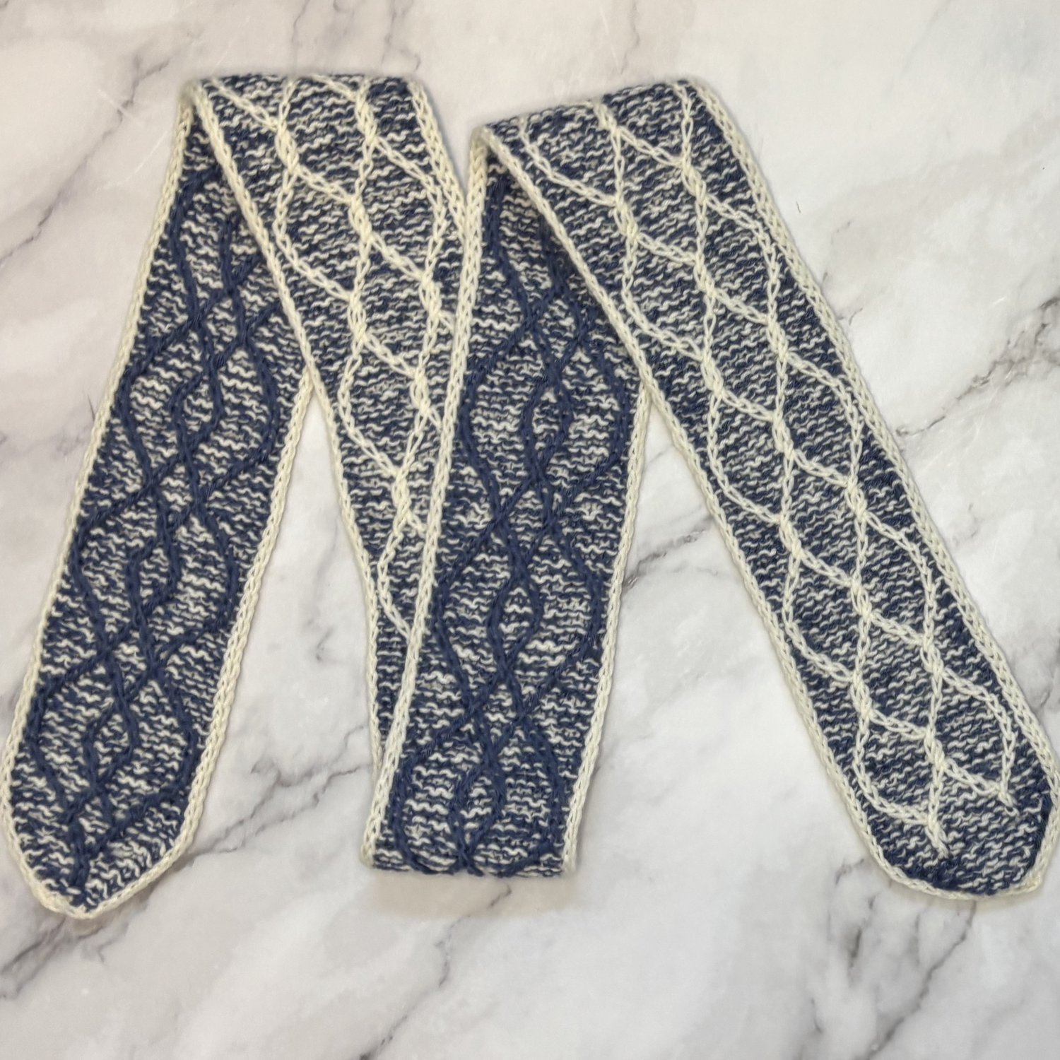 The Fission Festival scarves are worked with 2 yarns held together in a marl. The reversible design is created with Fission Knitting; the Fission Knitting Tutorials are available for all the cables.