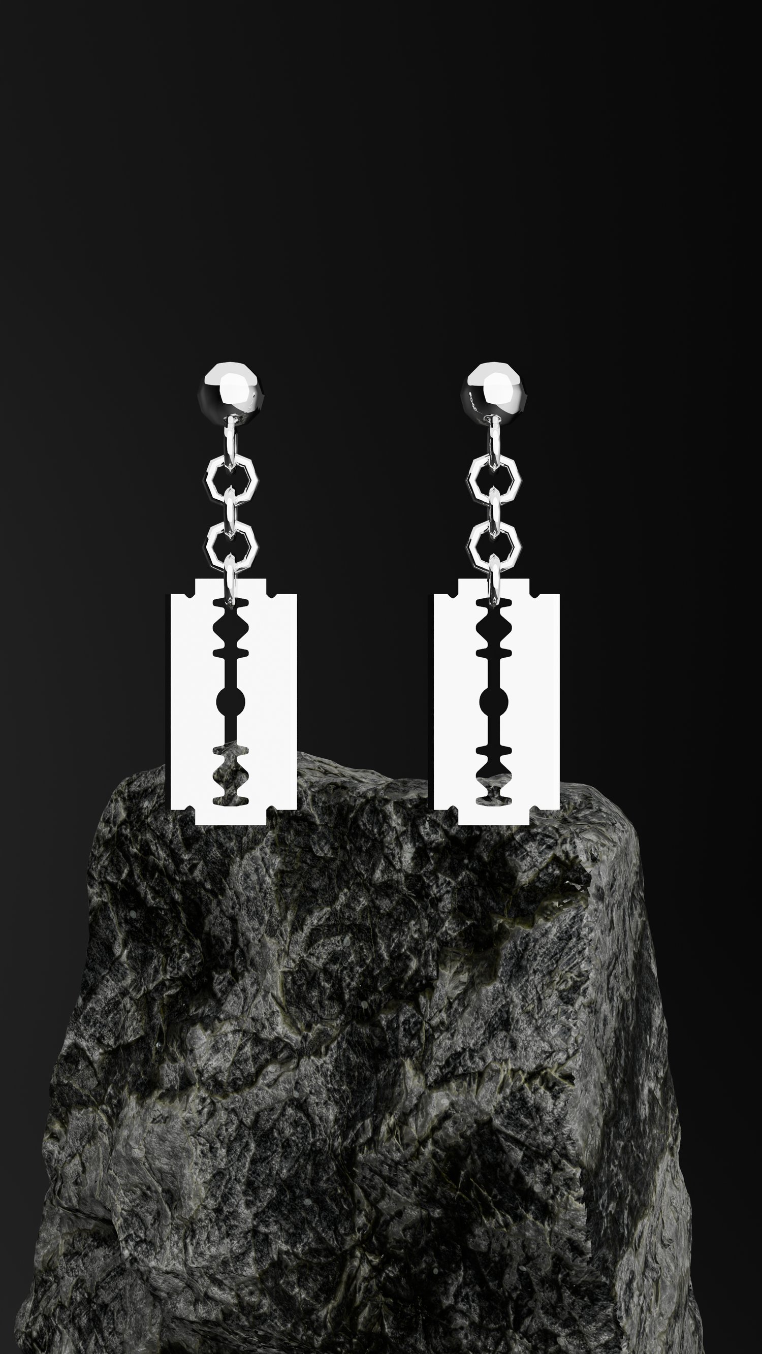 The Relapse is a pair of razor blade earrings that are sharp, minimal, and intentional. They don’t scream. They don’t glint. They just hang there, like a thought you swore you let go of.