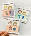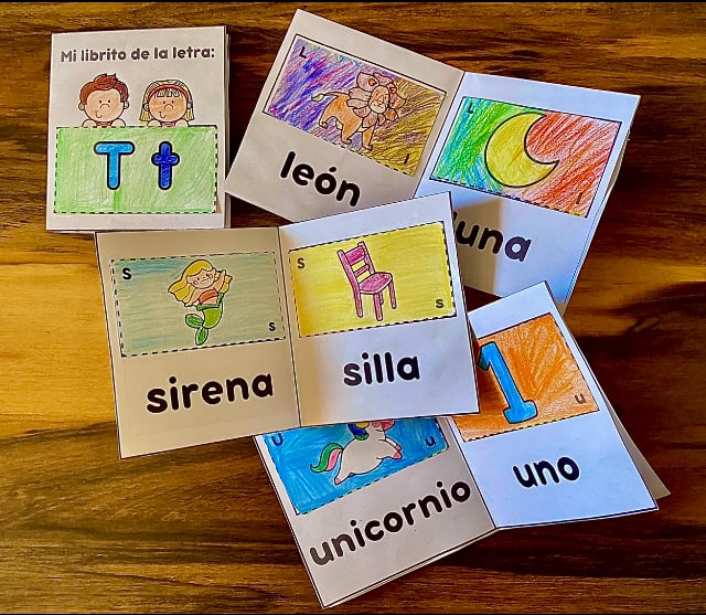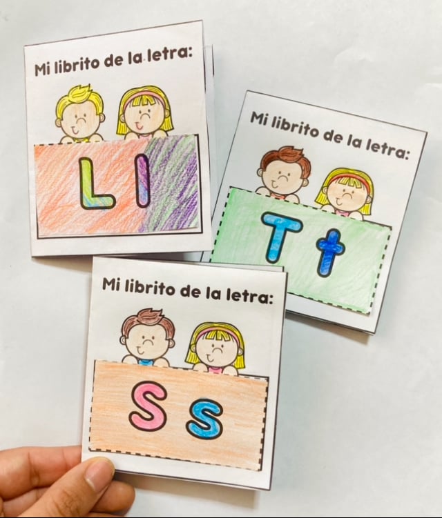 Cada librito contiene la letra minúscula y mayúscula y 3 imágenes relacionadas.
